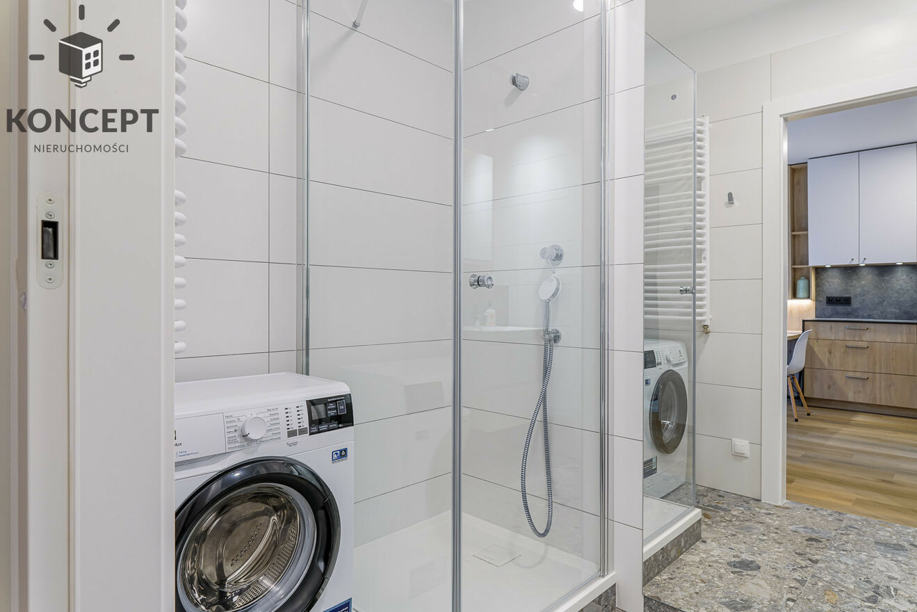 - Łazienka z prysznicem i pralką.