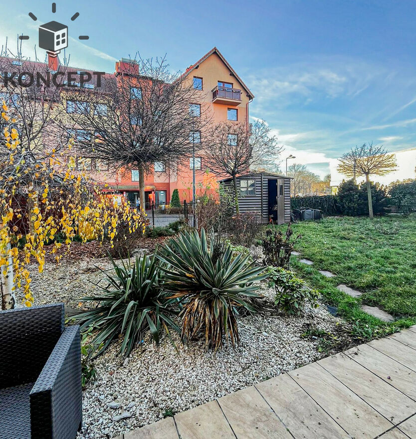 Do mieszkania przynależy duży urządzony ogród z tarasem oraz miejsce postojowe na parkingu podziemnym (dodatkowo płatne).