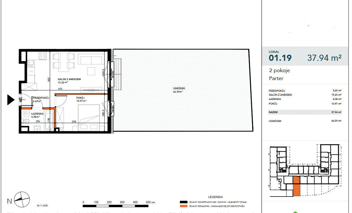 Proponowane mieszkanie znajduje się na parterze i ma powierzchnię 37,88m2 , a jego główne cechy to: