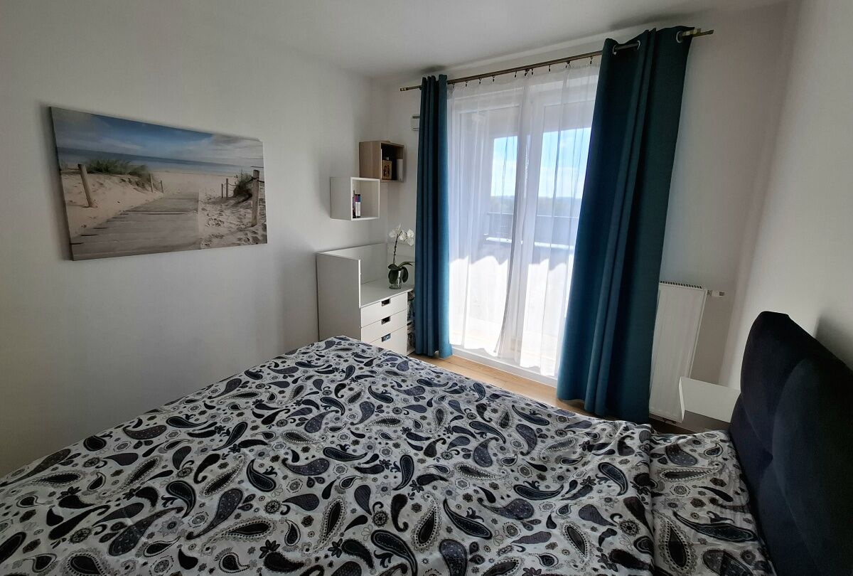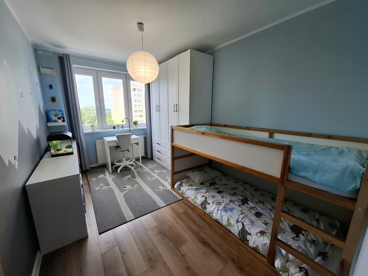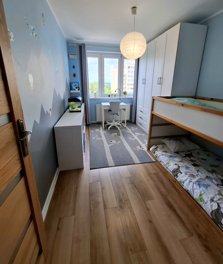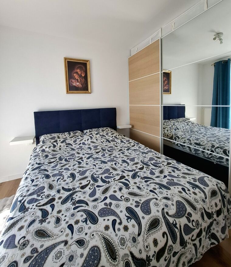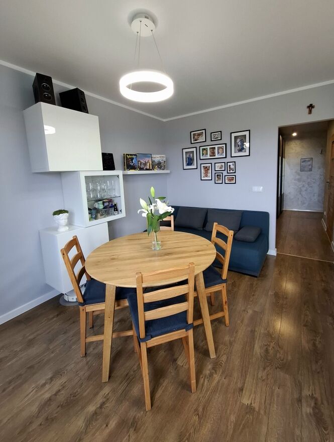 W pokojach pojemne szafy IKEA. W sypialni łóżko kontynentalne z zagłówkiem o szerokości 160 cm, w salonie rozkładana sofa, stół dębowy Woodica z opcją powiększenia na rodzinne przyjęcia.
