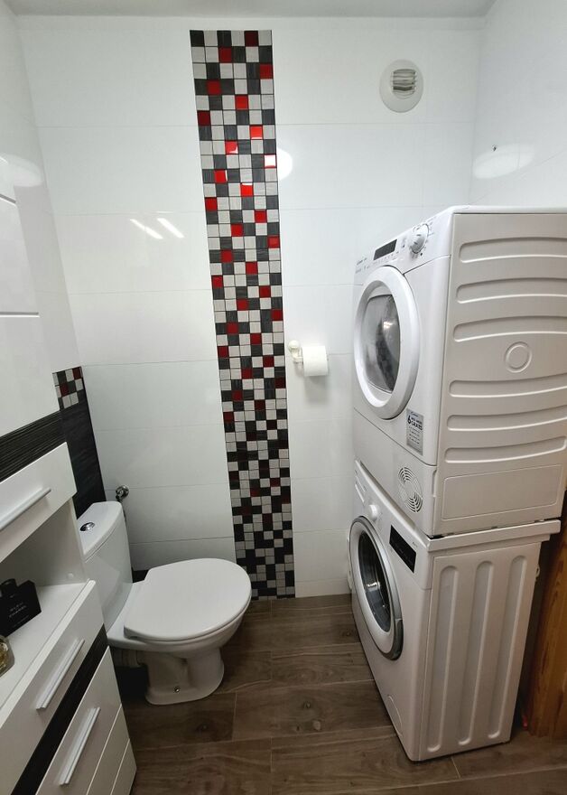 Klimatyzacja i rolety wewnętrzne zaciemniające w salonie, smart TV, pełne AGD (płyta indukcyjna, zmywarka, piekarnik, lodówko-zamrażarka, pralka, suszarka bębnowa).