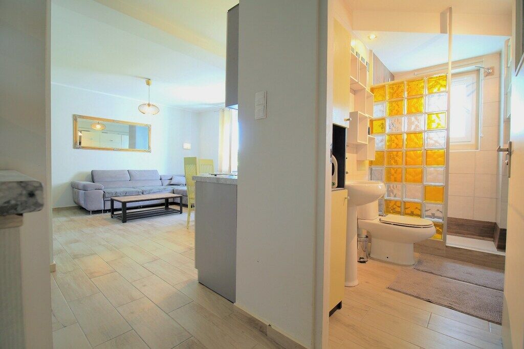 Przestronne mieszkanie składające się z przedpokoju, z któregowchodzimy do łazienki z wc i otwartego salonu z aneksem kuchennym