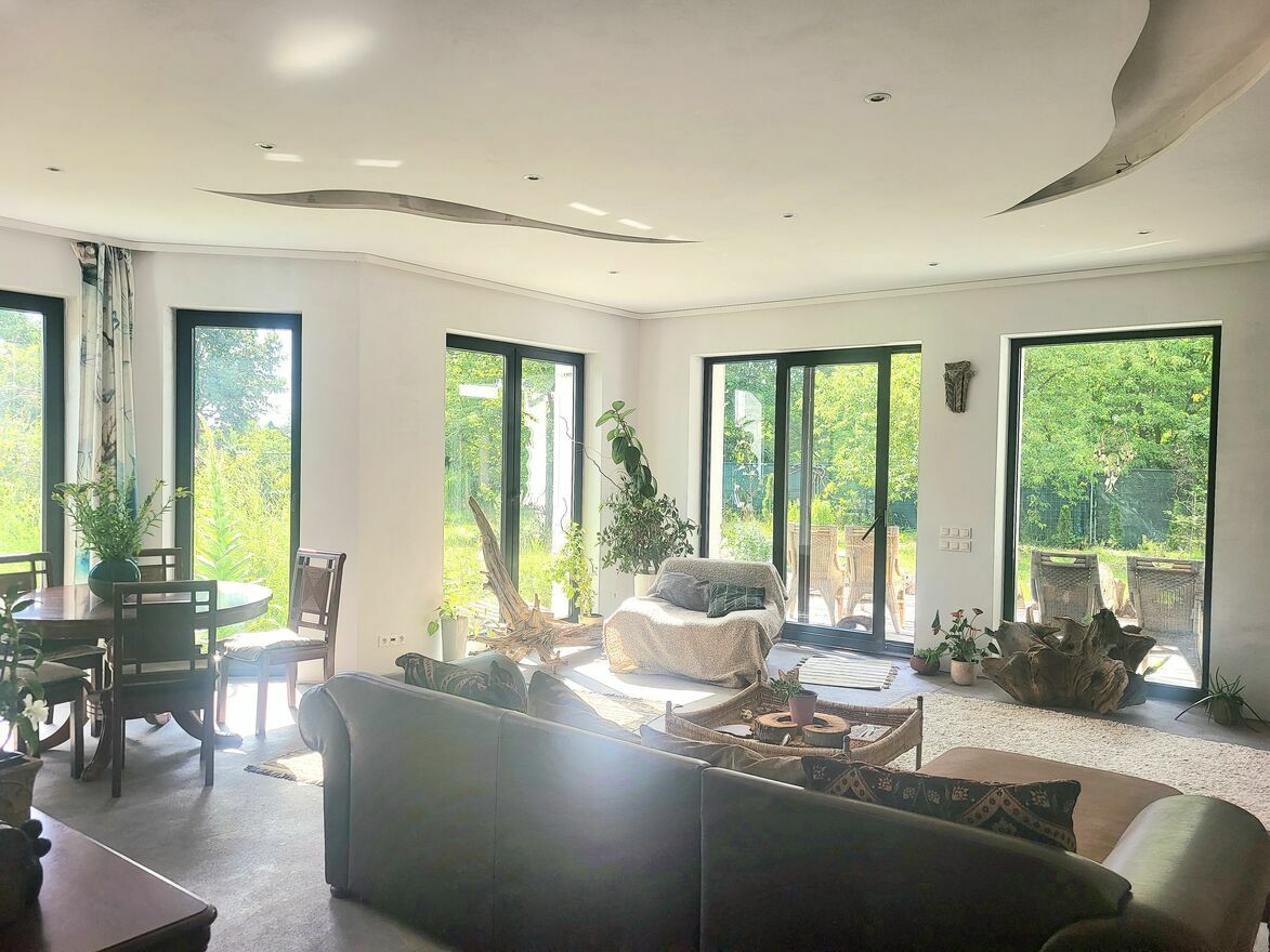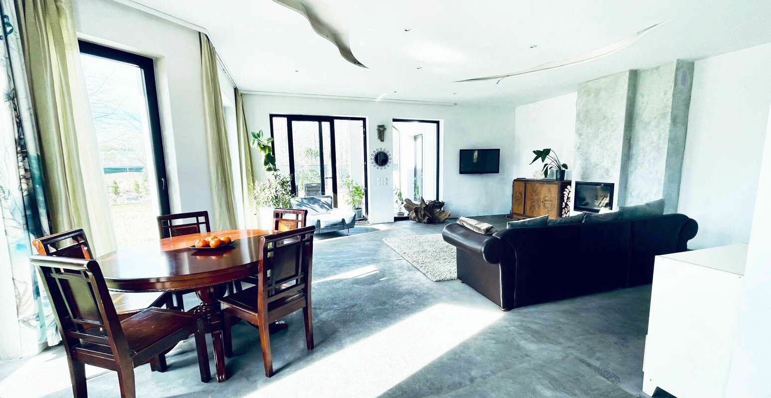 Parter to jasny, przestronny salon połączony z kuchnią (z możliwością wydzielenia), który stanowi serce domu, a szerokie przeszklenia otwierają wnętrze na ogród. Dzięki temu można cieszyć się bliskością natury oraz spektakularnymi zachodami słońca.