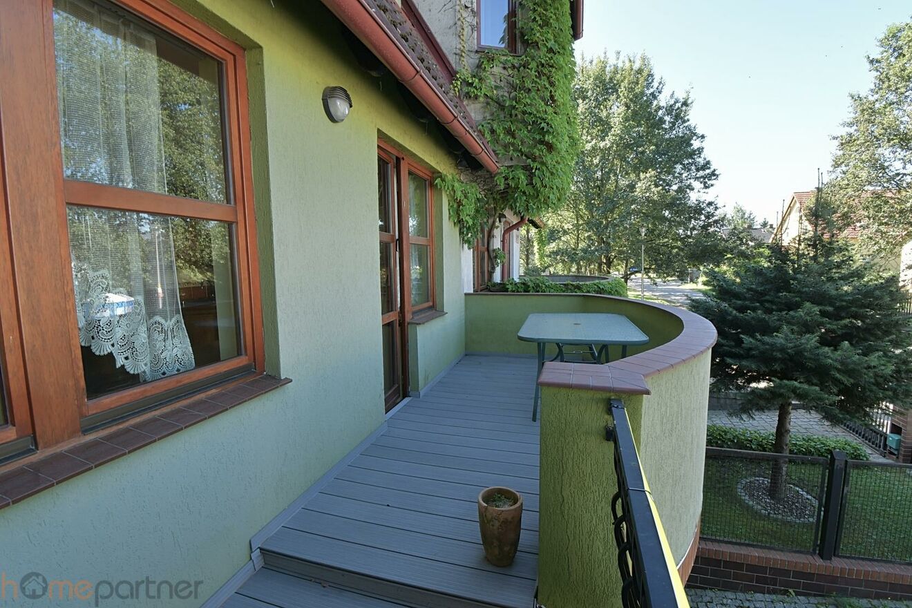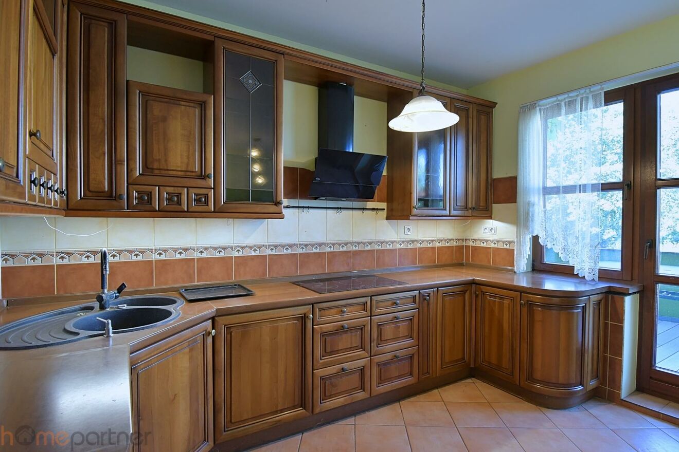 Salon wyposażony w obszerny narożnik, stół z 7 krzesłami. Salon posiada miejsce na kominek. Kuchnia drewniana w zabudowie, wyposażona w lodówko-zamrażarkę wolnostojącą Daewoo, płytę ceramiczną Smeg, piekarnik elektryczny wolnostojący Candy, mikrofalówkę Panasonic, okap, zmywarkę 60 cm Bosch. Trzy łazienki - dwie wyposażone w wanny oraz jedna z prysznicem. Ogrzewanie indywidualne, piec dwufunkcyjny gazowy z zasobnikiem , wymieniony 5 lat temu .Schody drewniane bukowe, w salonie podłoga drewniana, bukowa, w pozostałych pokojach parkiet. Granitowe parapety. Stolarka okienna drewniana, drzwiowa również drewniana. Na wszystkich tarasach wymieniona deska ok. 4 lat temu. W kuchni i łazienkach ogrzewanie podłogowe.