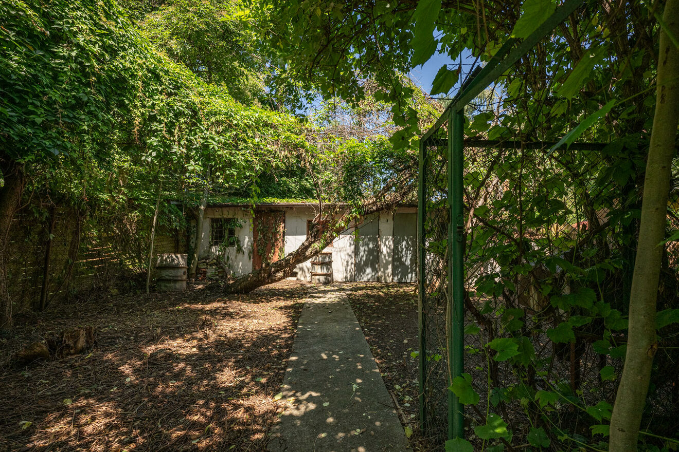 Dom jest podpiwniczony (wysokość ok.2,15 m), z przejezdnym garażem w bryle budynku oraz dodatkowymi miejscami na podjeździe. Posesja jest ogrodzona z przodu wysokim betonowym murem porośniętym zielenią, a w pozostałych częściach siatką.
