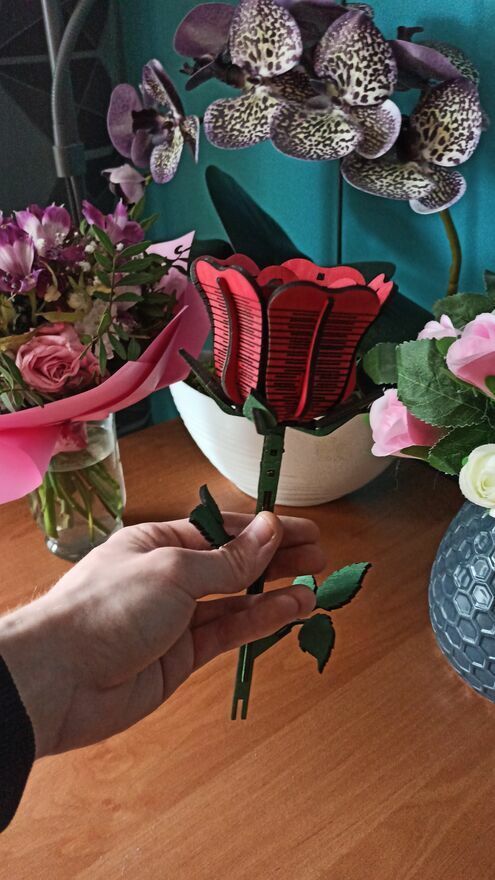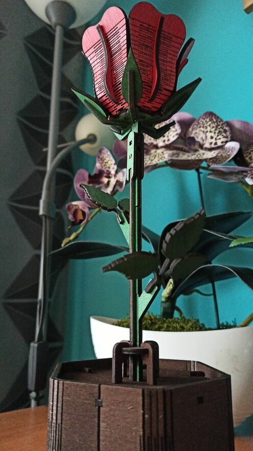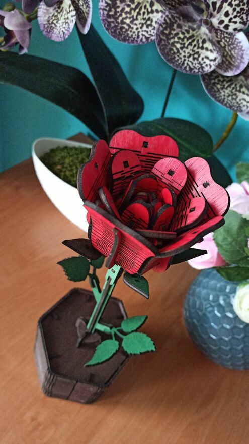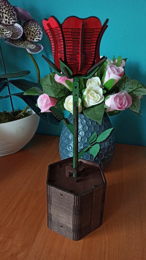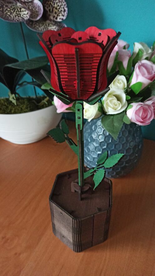 Drewniana wieczna róża to ręcznie wykonana dekoracja, która idealnie sprawdzi się jako prezent walentynkowy, rocznicowy lub po prostu – z serca.