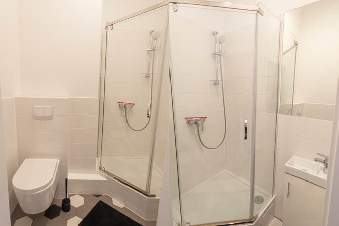 Łazienka: lustro, kabina, toaleta.