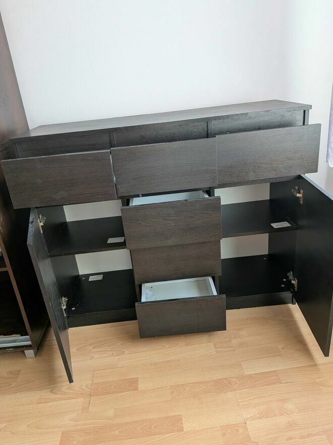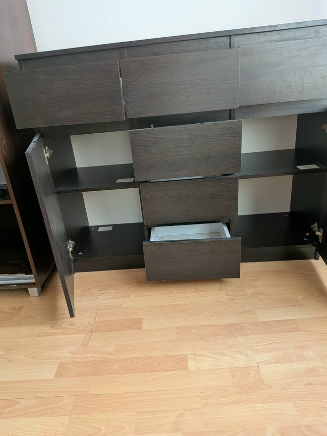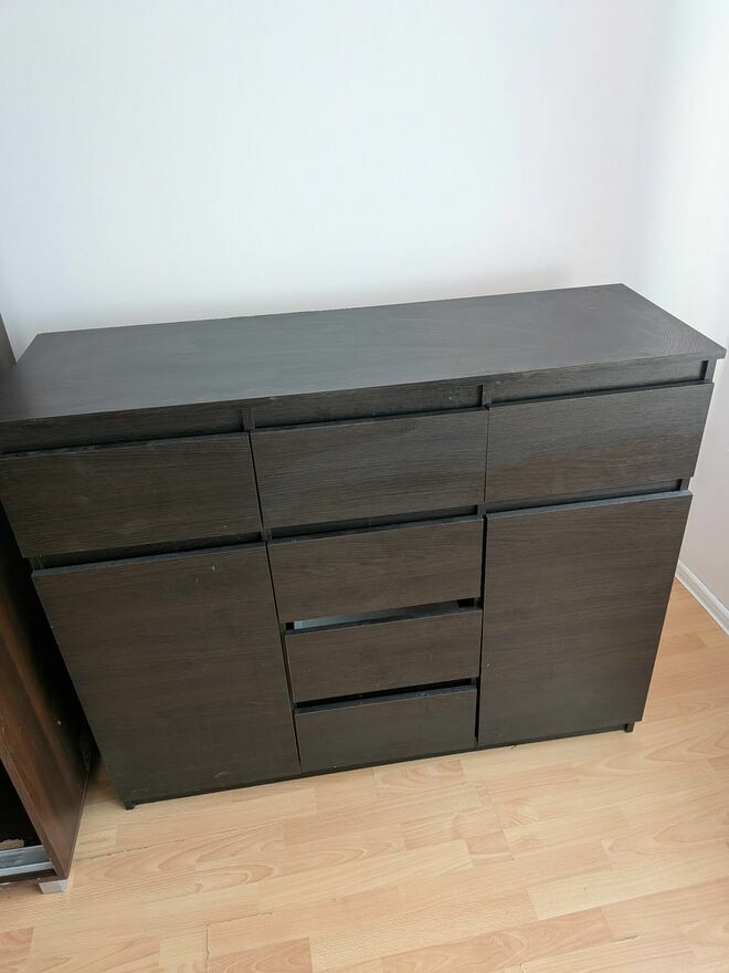 Duża komoda w bardzo dobrym stanie. Posiada wiele praktycznych szuflad i półek, które pozwolą na efektywne przechowywanie rzeczy. Solidna konstrukcja i ciemny kolor mebla sprawią, że będzie on pasował do różnych aranżacji wnętrz.Jakub