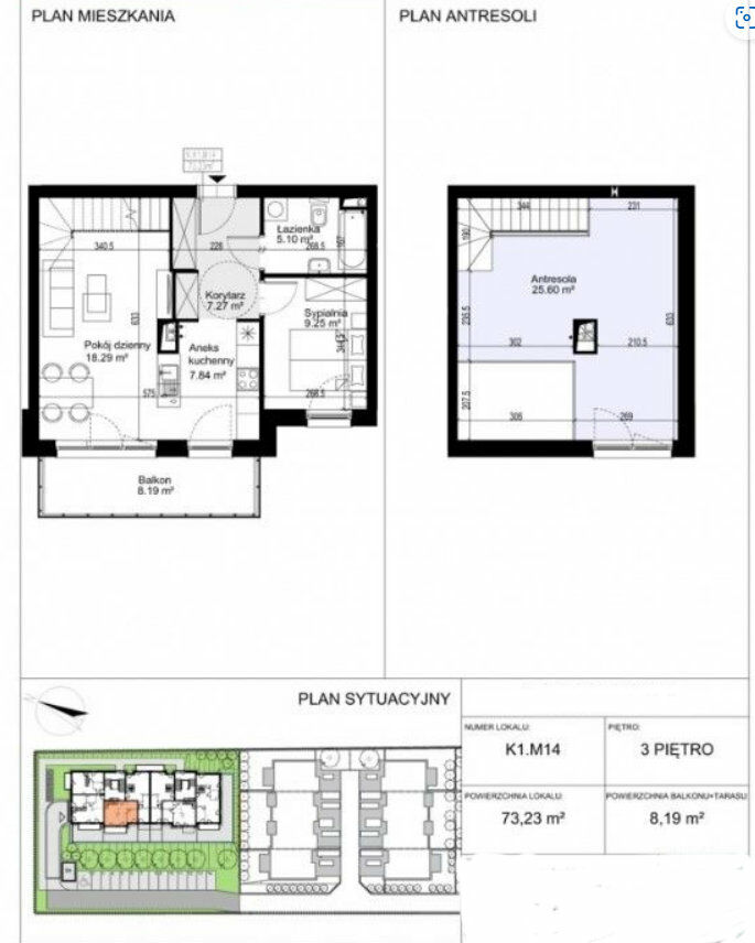 Proponowane mieszkanie – ma powierzchnię 73,49m2. Składa się z salonu o powierzchni 18,29m2 z aneksem kuchennym o powierzchni 7,84m2, z salonu wyjście na balkon o powierzchni 8,19m2. W mieszkaniu znajduje się również sypialnia o powierzchni 9,25m2 , antresola o powierzchni 25,60 oraz łazienka o powierzchni 5,10m2.