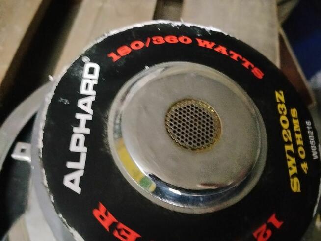 Głośnik marki Alphard wielkości 12 cali. Produkt używany. Cicho gra prawdopodobnie do wymiany cewka.