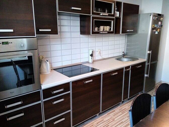Kuchnia: szafki wiszące i stojące, stół z krzesłami, piekarnik