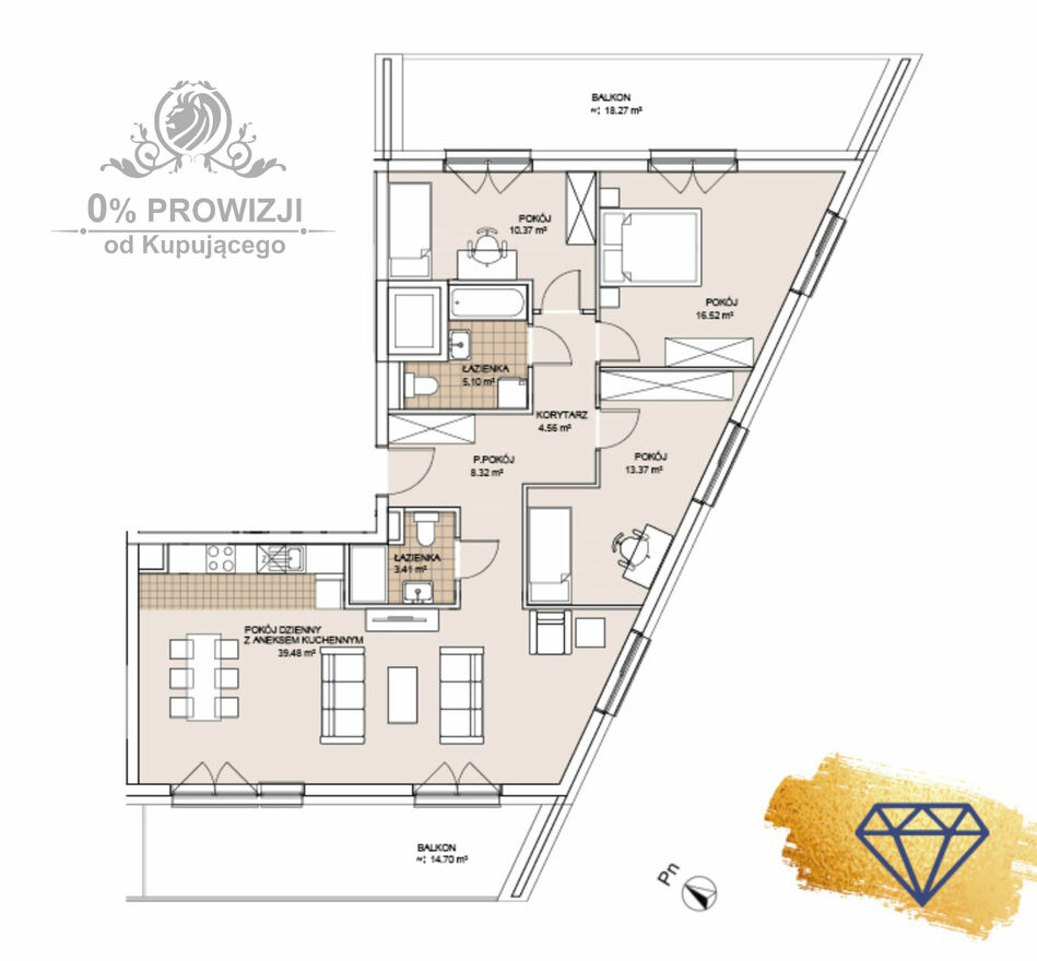 Mieszkanie jest 4 - pokojowe ma pow. 101,13m2 znajduje się na 2 piętrze w 9 piętrowym apartamentowcu z windą z poziomu garaży. Główną część mieszkania stanowi pokój dzienny z kuchnią w aneksie o pow. 39,48m2 i trzech oddzielnych pokoi o pow. 16,52m2, 13,37m2 i 9,69m2 – z każdego z pokoi łącznie z salonem wyjście na dwa oddzielne balkony o pow. 10,37m2. W mieszkaniu mamy przewidziane jedną dużą łazienkę z toaletą o pow. 5,10m2 i drugą oddzielną łazienkę o pow. 3,41m2 (świetne rozwiązanie przy dużych mieszkaniach) mamy też przedpokój z miejscem na szafę w zabudowie.