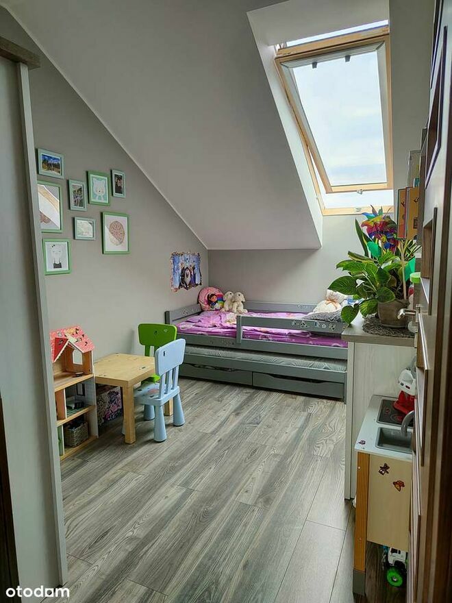Metraż mieszkania to 61,8m2 na drugim piętrze ze skosami w dwóch sypialniach i kuchni, po podłodze 68m2.
