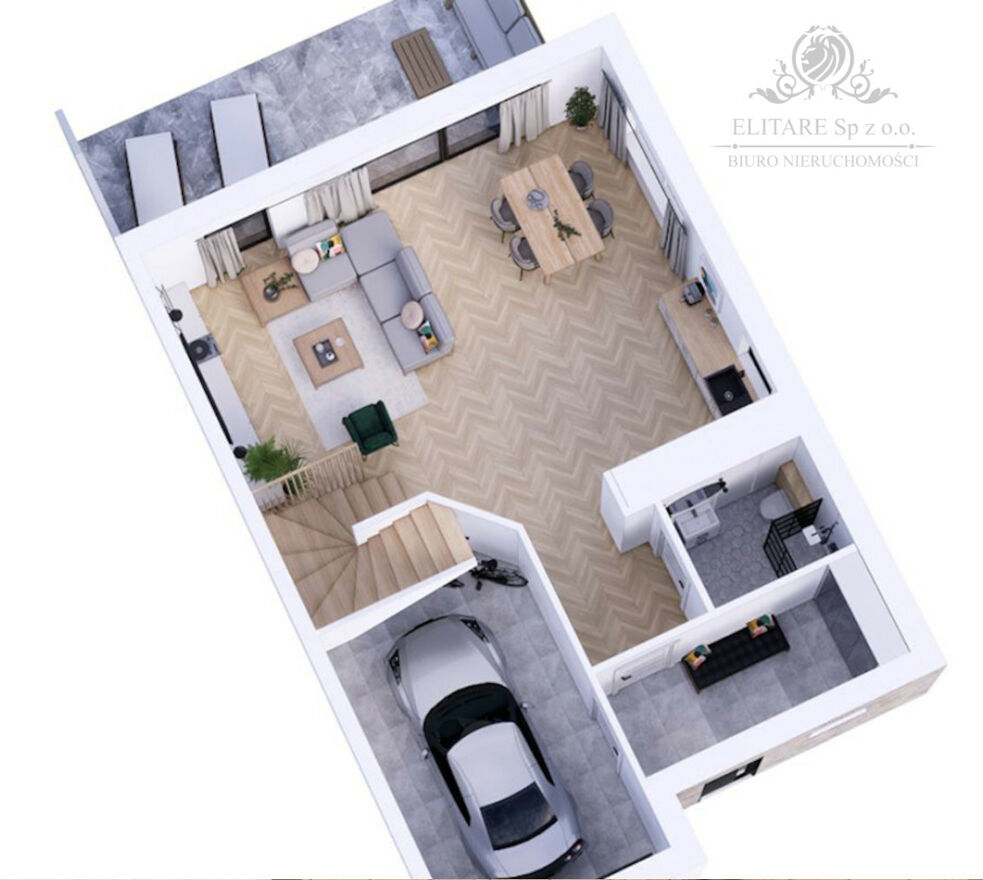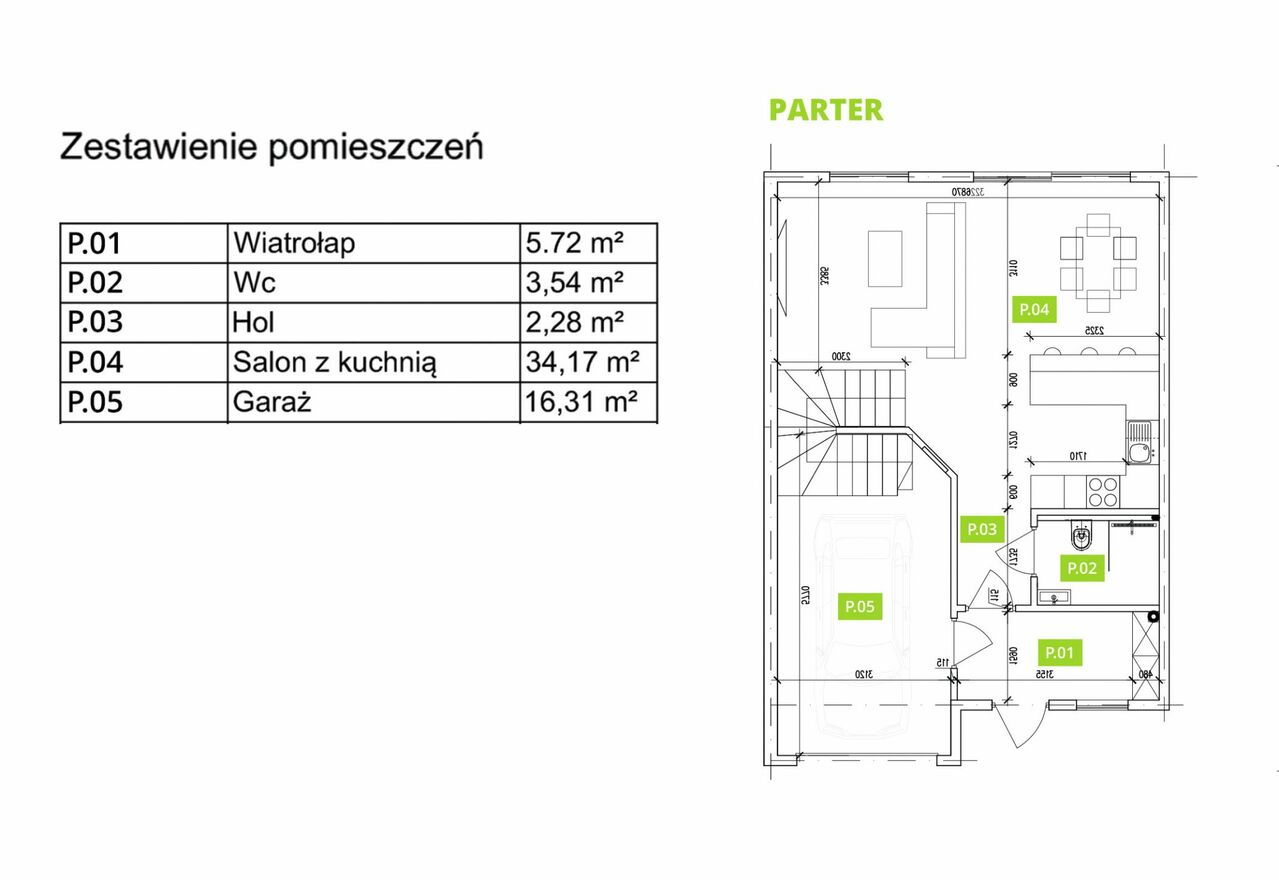 Na parterze w strefie dziennej znajduje się otwarty salon z jadalnia i kuchnia w aneksie (34,17m2) z wyjściem na ogród. Na parterze znajdziemy również wiatrołap z miejscem na dużą szafek w zabudowie (5,72m2), w bryle domu jest również garaż (16,31m2), na tym poziomie znajduje się również toaleta (2,28m2), a schody z korytarza zaprowadzą Państwa na drugą kondygnacje do strefy nocnej.