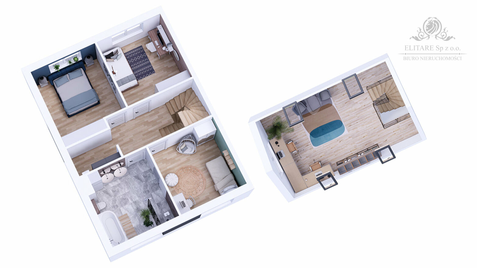 Na poziomie piętra mamy klasyczny 4 pokojowy układ pomieszczeń i dużą łazienkę (9,89m2), a wyżej schody zaprowadzą Państwa na poziom otwartego poddasza o powierzchni użytkowej 23,56m2 .