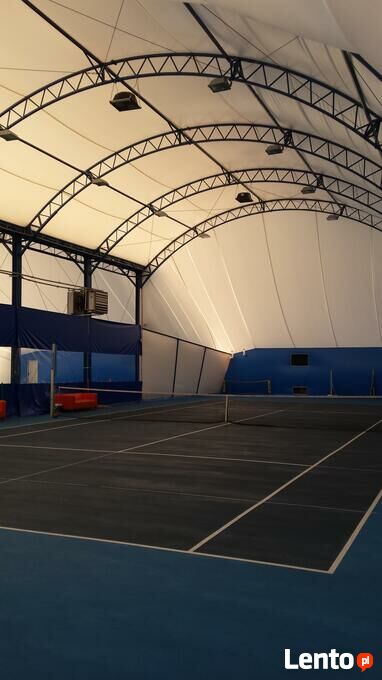 100% sprawna, dwa piece olejowe, nowe oświetlenie obu kortów, ponadnormatywna wysokość obu hal, konstrukcja stalowa indywidualna, dwie warstwy PCV ze stalym nadmuchem. Idealna na upały i mróz. Stan idealny.Cena dotyczy obu hal wraz z osprzętem i wyposażeniem.