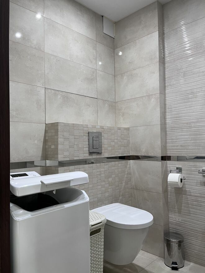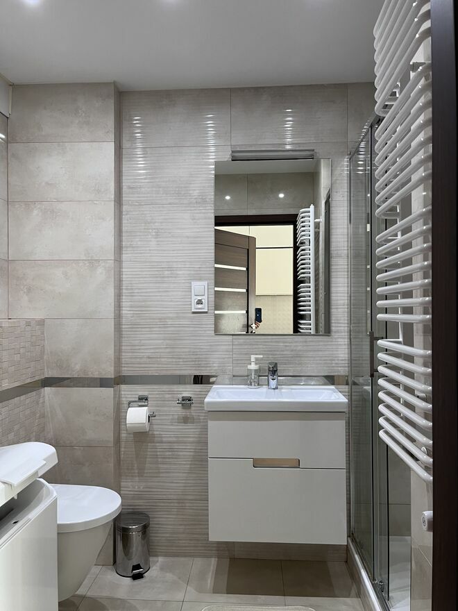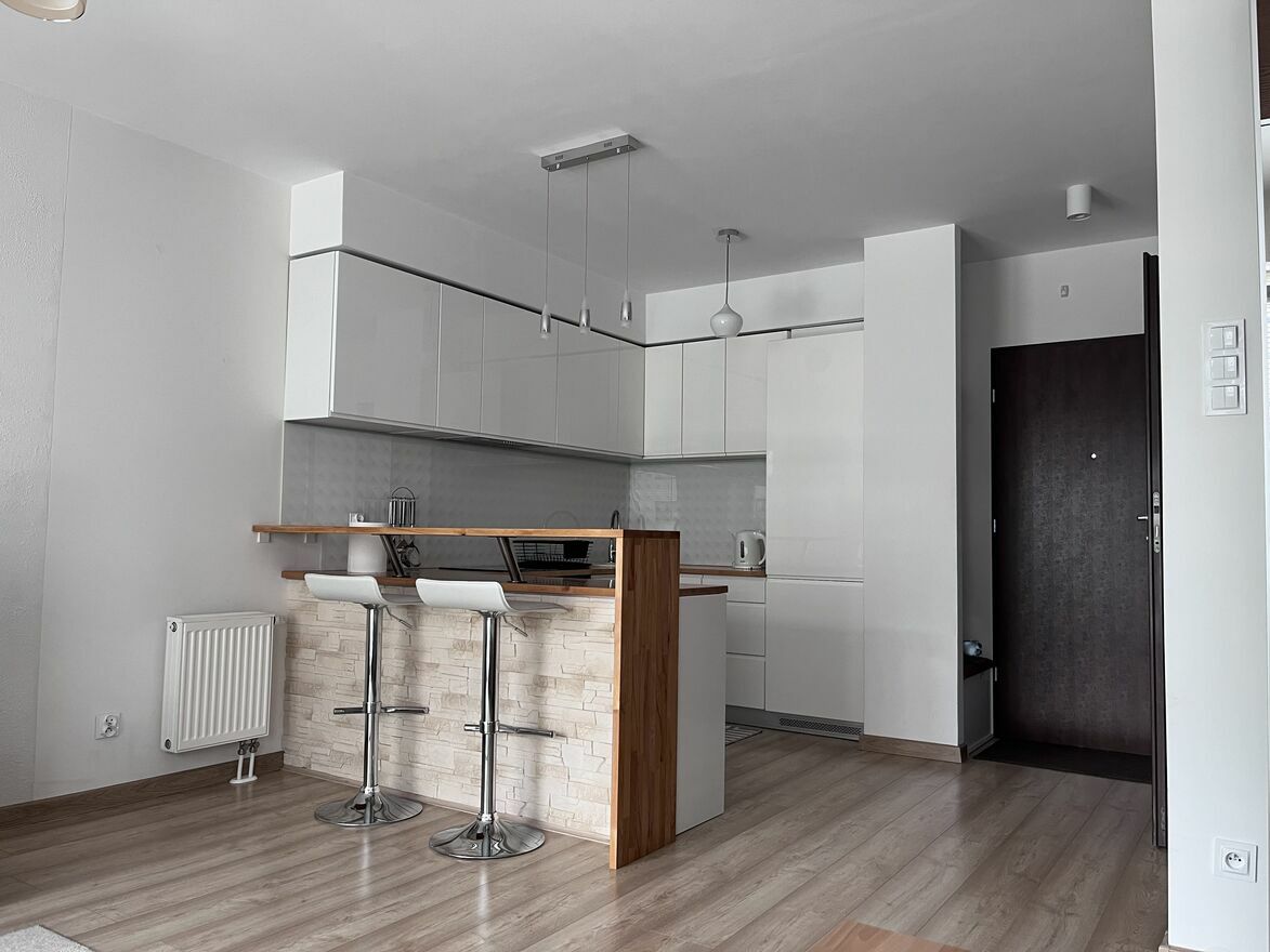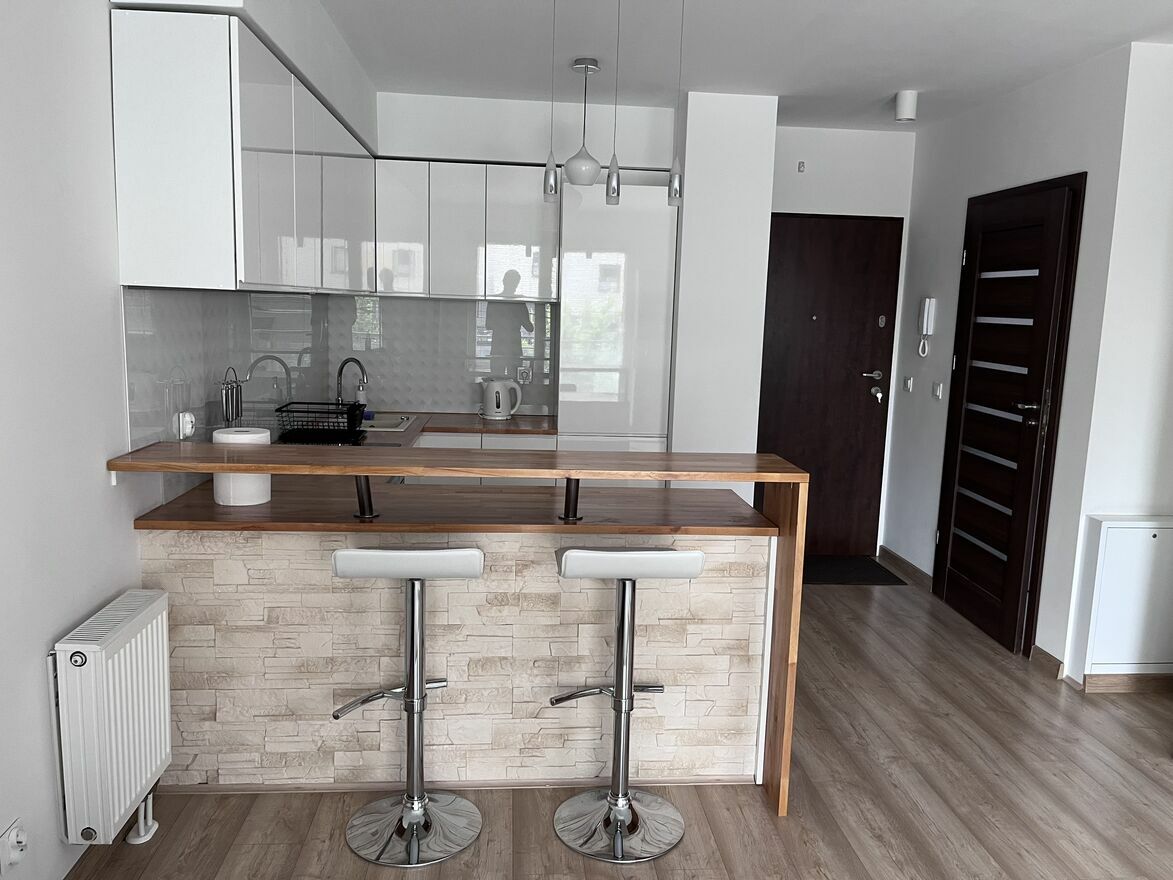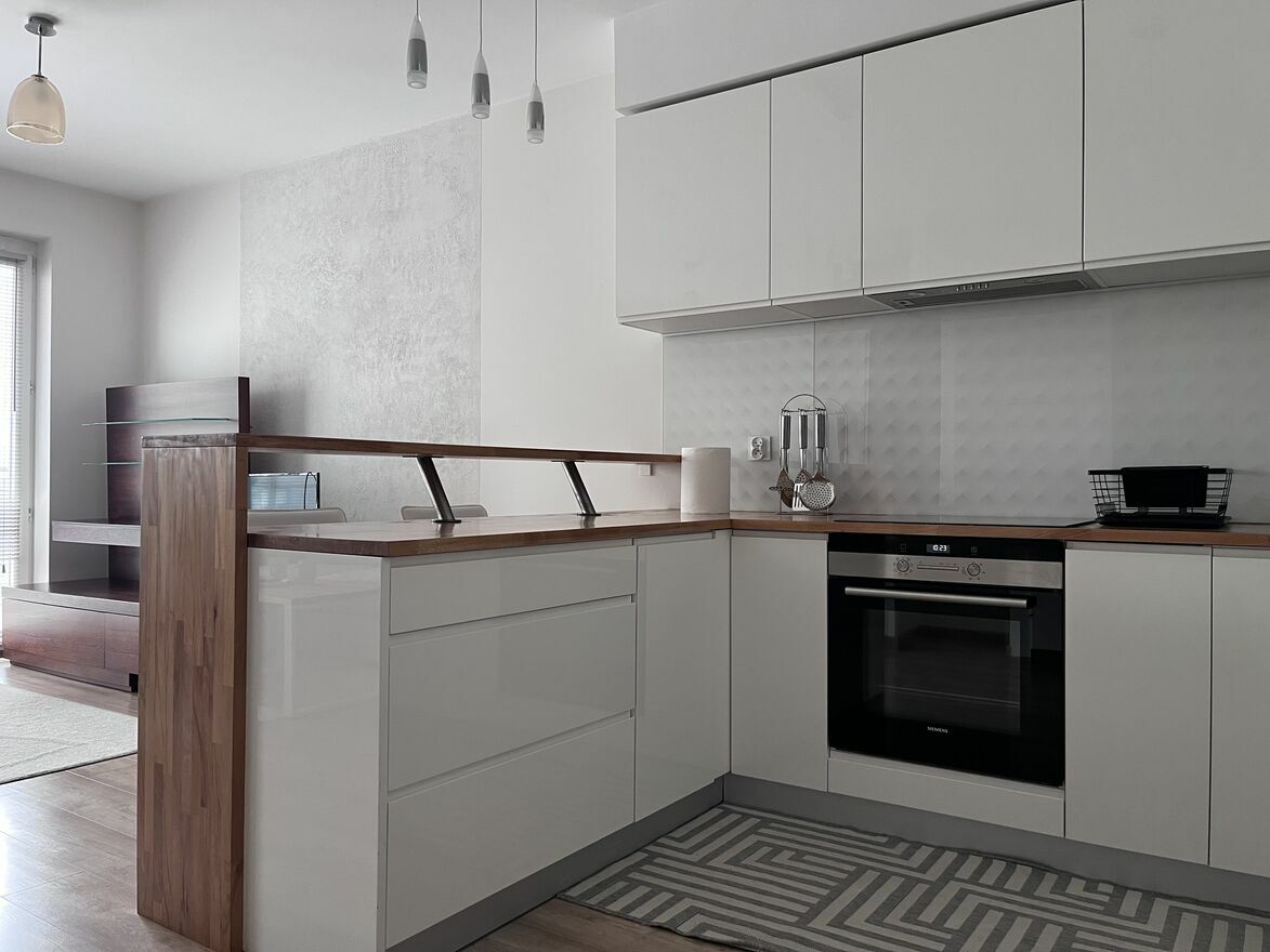 Kuchnia : meble w połysku pod pełną zabudowę , sprzęt: lodówko-zamrażarka , piekarnik , płyta indukcyjna, czajnik elektryczny. Dostępne garnki, talerze, sztućce.