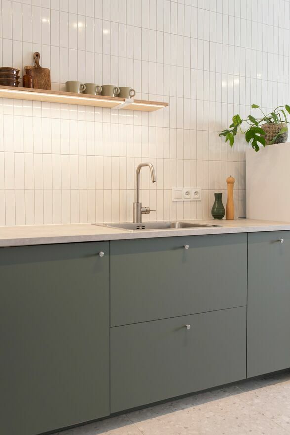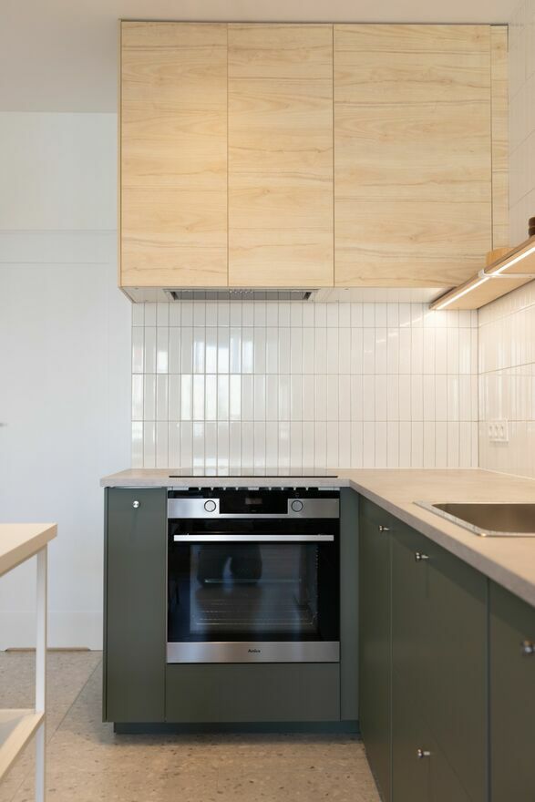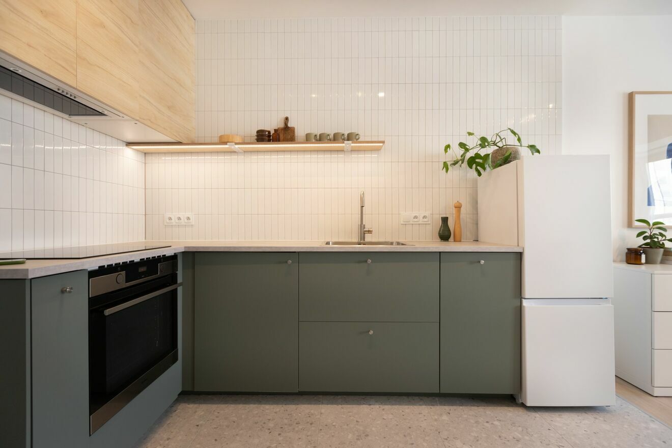 Kuchnia posiada dużą powierzchnię roboczą, dodatkowo wzbogaconą o wyspę z hokerami. Wygodny i przemyślany układ wraz z miejscem do segregowania śmieci. Blat roboczy posiada dodatkowe oświetlenie. Szafki są bardzo pojemne, umożliwiają wygodne przechowywanie sprzętów kuchennych i przyrządzanie posiłków.