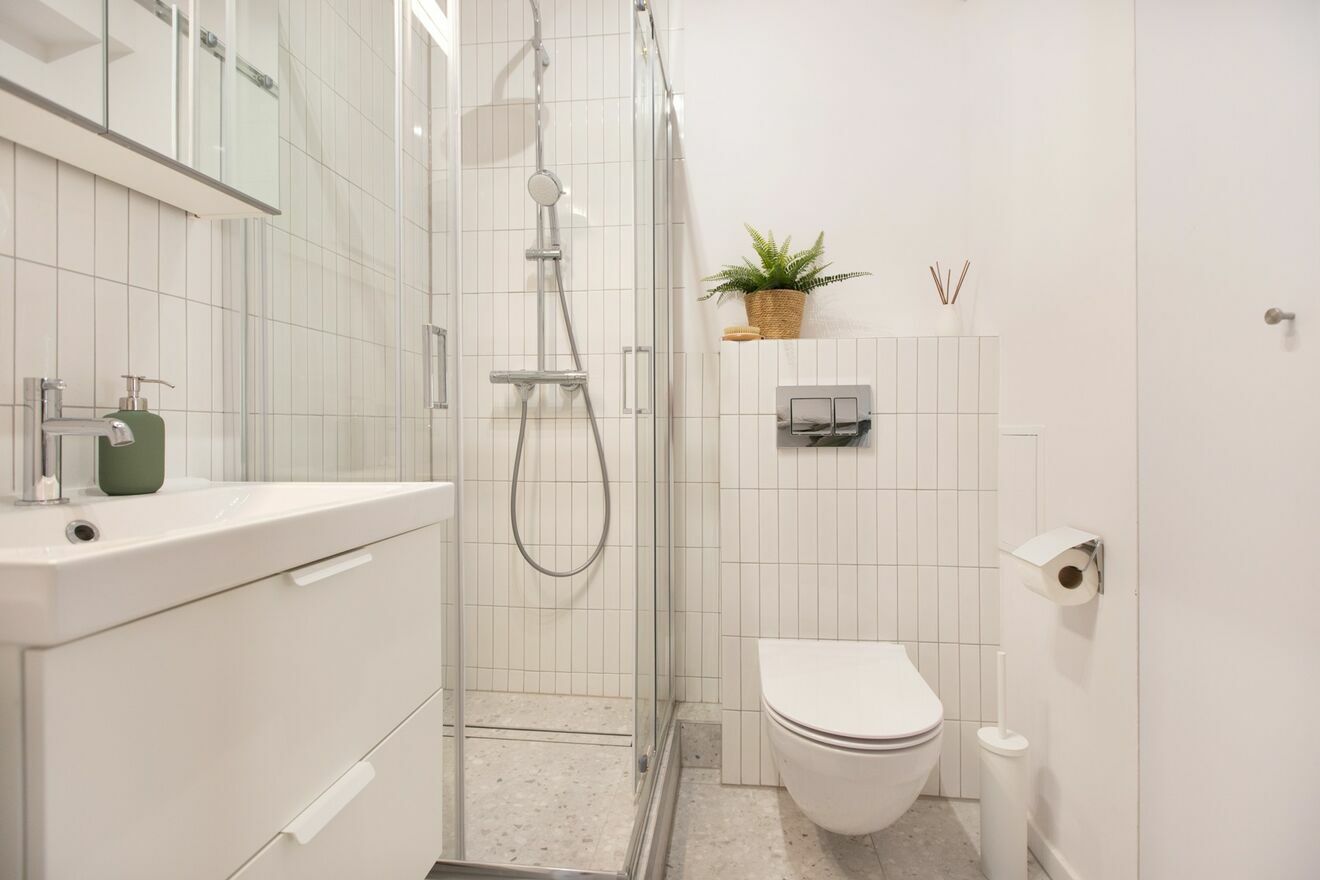 Łazienka sterylnie czysta, jasna z kabiną prysznicową wyposażoną w deszczownicę. W łazience znajduję się WC w zabudowie, umywalka wraz z szafką, oświetlonym lustrem z miejscem na kosmetyki oraz zabudowaną we wnęce szafką na środki czystości, ręczniki itp. Szafka jest bardzo pojemna, ukryta w ścianie.