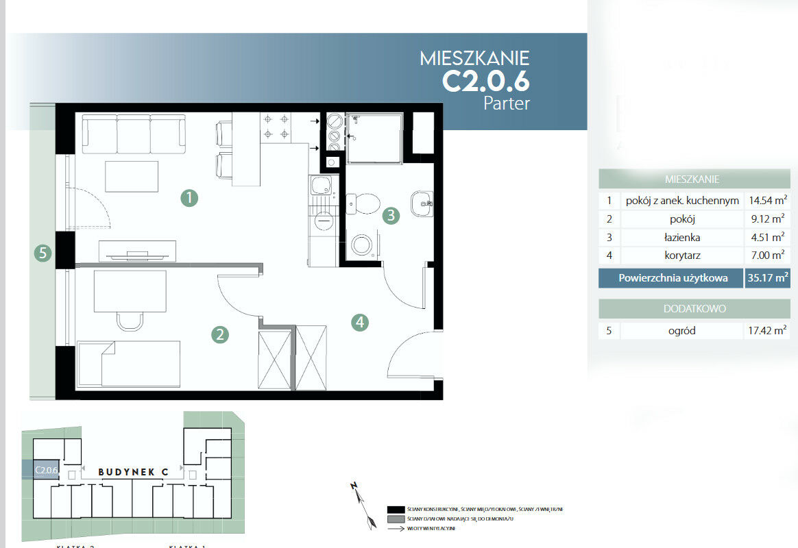Zapraszam do zakupu pięknej kawalerki w zielonej i cichej okolicy a jednocześnie z dobrą komunikacją i dobrym dojazdem do obwodnicy Wrocławia. Mieszkanie idealne pod inwestycję lub zamieszkania. Kompleks składa się z trzech nowoczesnych budynków, oferujących mieszkania o różnorodnych powierzchniach, od 25 m² do 103 m². Każde mieszkanie w kompleksie ma dostęp do prywatnej przestrzeni zewnętrznej — balkonów lub ogrodów, idealnych do relaksu i spędzania czasu na świeżym powietrzu. Ogrody, przynależące do lokali na parterze, oferują mieszkańcom możliwość stworzenia wyjątkowej strefy wypoczynku w otoczeniu natury.Prezentowane mieszkanie ma powierzchnię 35,17m2 i znajduje się na parterze w czterokondygnacyjnym budynku a jego główne cechy to- salon z aneksem kuchennym o powierzchni 14,54m2 z wyjściem na ogród o powierzchni 17,42m2, sypialnia o powierzchni 9,12m2 , łazienka op powierzchni 4,51m2 , przedpokój o powierzchni 7m2.