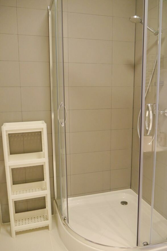 Łazienka jest wyposażona w kabinę prysznicową, pralkę, WC,