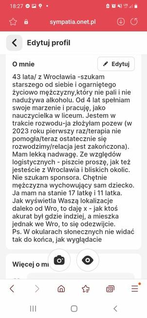 Nie interesuja mnie mężczyzni zajęci ,spoza Wrocławia. Szukam równolatka. Nie interesuje mnie bycie ta druga trzecia ...