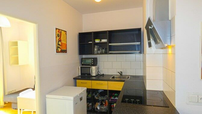 Kuchnia: szafki, lodówka, płyta elektryczna, zlewozmywak, okap,