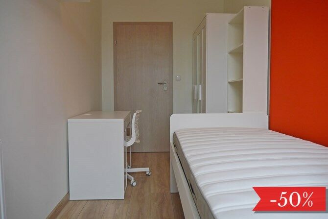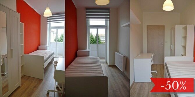 Pokój: prywatna lodówka, łóżko, duża szafa, regał, półka oraz