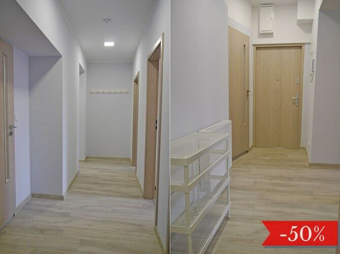 Przedpokój jest wyposażony w wieszaki oraz półki na buty.