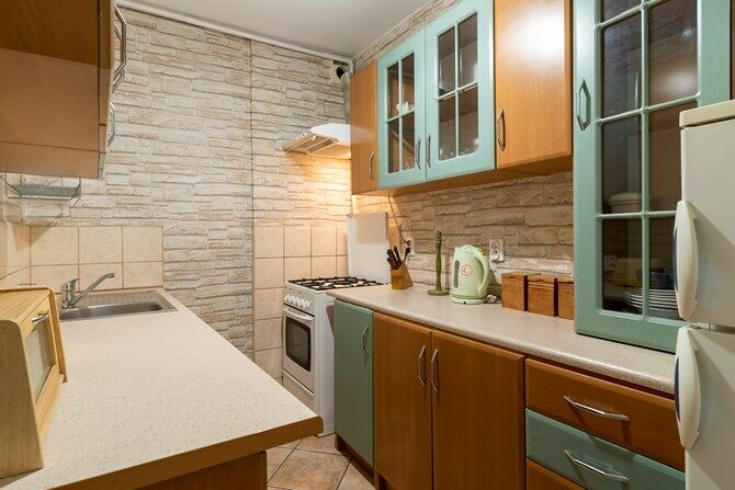 Kuchnia: szafki wiszące i stojące, lodówka, kuchenka