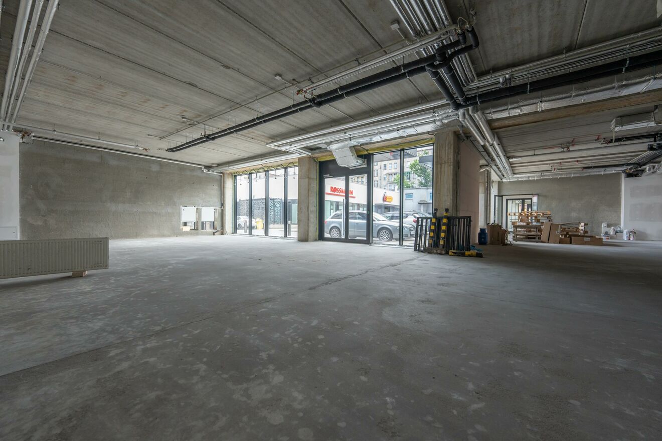 Pasaż w kształcie litery "U", z dużymi witrynami, z parkingiem na dziedzińcu.