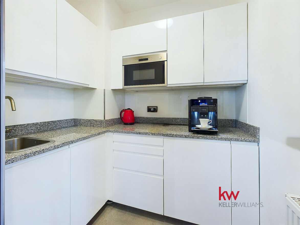 Wykończenie jest spójne, nowoczesne z loftowym charakterem. Zamontowany system alarmowy, stylowe żaluzje drewniane w antracycie. Kuchnia kompleksowo wyposażona z zastawą stołową, zmywarką, lodówką i mikrofalą.