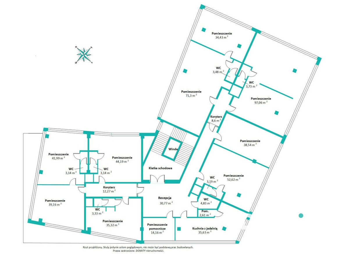 Biuro 2 - 333,79 m² obejmujące 6 pomieszczenia, 3 toalety, korytarz
