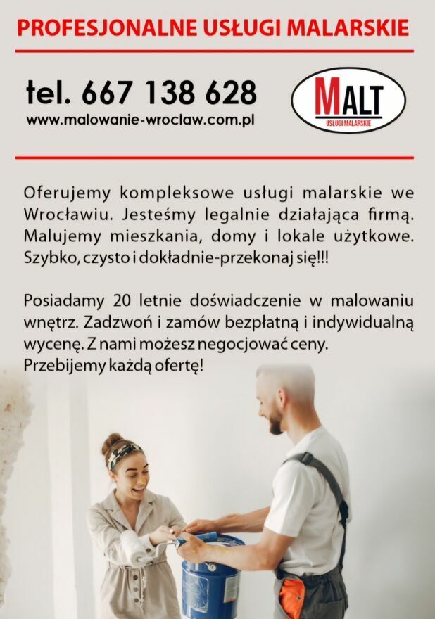 > Profesjonalne usługi malarskie we WrocławiuJesteśmy specjalistami w dziedzinie malowania mieszkań, domów i lokali komercyjnych na terenie Wrocławia i okolic. Wykonujemy każde zlecenie — od niewielkiego pokoju po dużą przestrzeń biurową — z dbałością o jakość, terminowość i estetykę. Nasze usługi obejmują malowanie ścian, sufitów, powierzchni wewnętrznych oraz komercyjnych, a portfolio realizacji dostępne jest w galerii. Korzystamy z nowoczesnych materiałów i sprawdzonych technik, by zapewnić trwały i efektowny rezultat. Zaufaj doświadczeniu i skontaktuj się z nami — wycena jest bezpłatna. Więcej informacji na : www.malowanie-wroclaw.com.pl