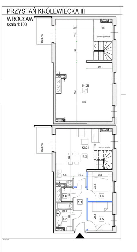 Mieszkanie położone jest na 2 piętrze w 2 piętrowym bloku z windą. Powierzchnia mieszkania to 95,85 m2, na którą składa się pokój dzienny z kuchnią w aneksie o pow. 27,60 m2, z salonu wyjście na balkon o powierzchni 3,9 m2. W mieszkaniu na pierwszym poziomie znajduje się 2 oddzielne pokoje o powierzchniach 7,26m2 oraz 6,95 m2. Dodatkowo na tym poziomie znajduje się łazienka o powierzchni 4,44m2, przestrzeń na oddzielną garderobę o pow. 1,53m2oraz schody prowadzące na drugi poziom mieszkania – antresola o powierzchni 48,07 m2 z antresoli wyjście na drugi balkon o powierzchni 3,9 m2.