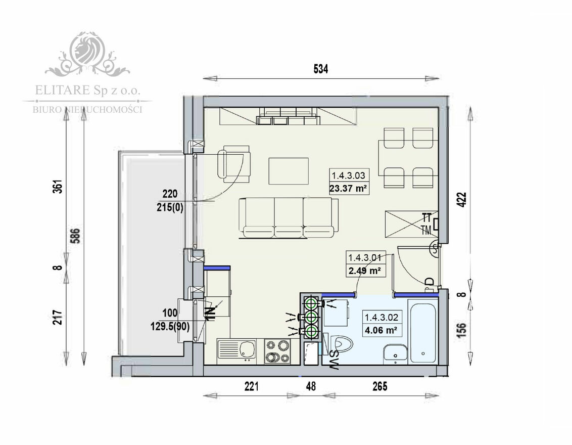 Powierzchnia mieszkania to 29,92 m2, na którą składa się pokój z kuchnią w aneksie o pow.23,37m2 z wyjściem na balkon 9,5m2, w mieszkaniu mamy też łazienkę z toaletą o pow. 4,06m2 oraz przedpokój z miejscem na szafę w zabudowie. Wysokość mieszkania 268cm.