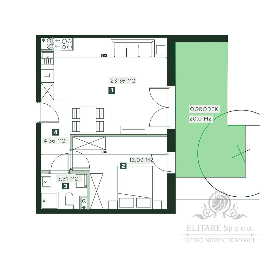 Rozkładowe, klasyczne 2 pokojowe mieszkanie o powierzchni 44,13m2 z ogrodem 20m2 na zielonych, spokojnych Żernikach w zachodniej części Wrocławia.Mieszkanie ma pow. 44,13m2 znajduje się na parterze w 3 piętrowym bloku z windą. Główna część mieszkania stanowi salon o pow. 23,36m2 z kuchnią w aneksie, z salonu wyjście na ogród o pow. 20m2, w mieszkaniu mamy drugi oddzielny pokój o pow. 13,09m2, łazienkę z toaletą o pow. 3,31m2 i przedpokój.