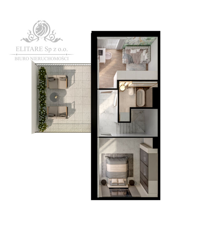 STREFĘ DZIENNĄ na parterze - układ otwartego salonu z jadalnią o powierzchni 21,09 z salonu wyjście na wewnętrzny ogród o pow. 16,30m2, mamy też oddzielną kuchnie o pow. 6,05m2 i osobną sypialnie/gabinet o pow. 10,30m2, na tym poziomie znajduje się też pierwsza łazienka z miejscem na prysznic, toaletę i umywalkę o pow. 3,28m2 i wiatrołap z miejscem na szafę w zabudowie, schodami żelbetowymi z korytarza wchodzimy na drugą kondygnacje.
