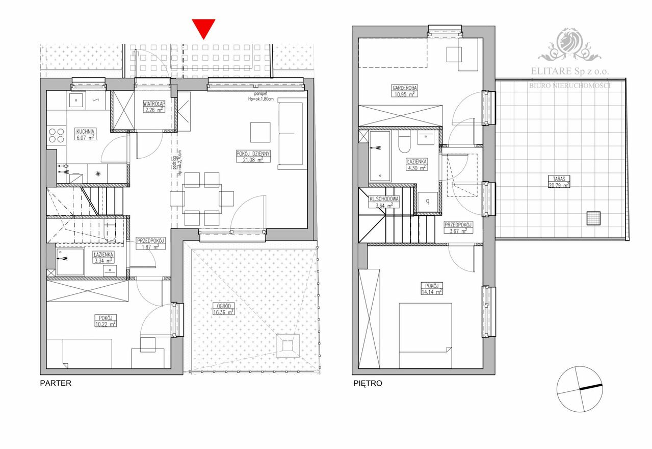 STREFA NOCNA na piętrze to 2 oddzielne pokoje o pow. 14,14m2 i 10,95m2, z korytarza oraz mniejszego pokoju wyjście na taras o pow.20,79m2, na tym poziomie mamy też drugą łazienkę z miejscem na wannę, toaletę, umywalkę i pralkę o pow.4,30m2.