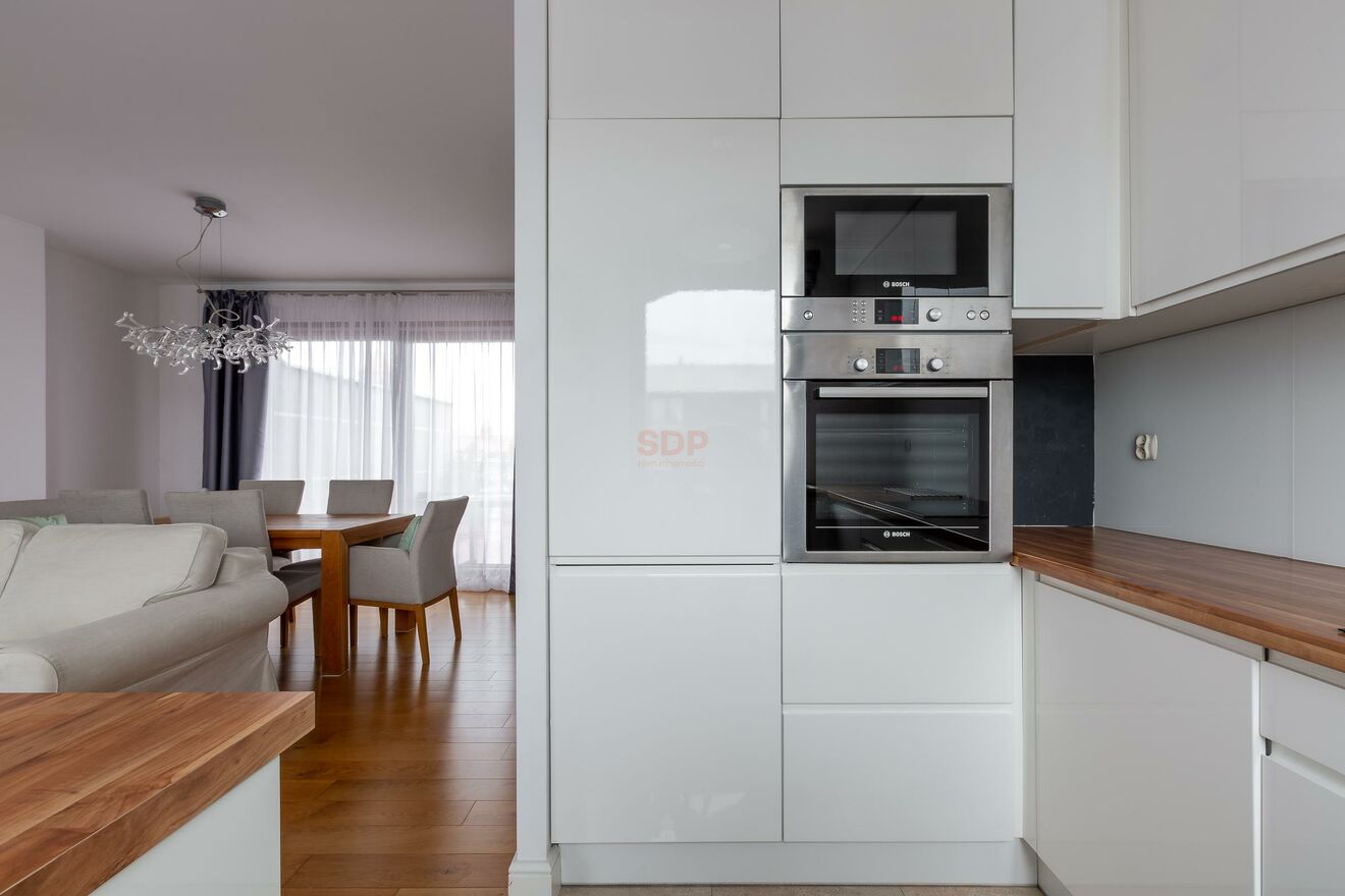 - Aneks kuchenny (meble w zabudowie, płyta indukcyjna, piekarnik, mikrofala, lodówka z zamrażalką, zmywarka, wyspa)