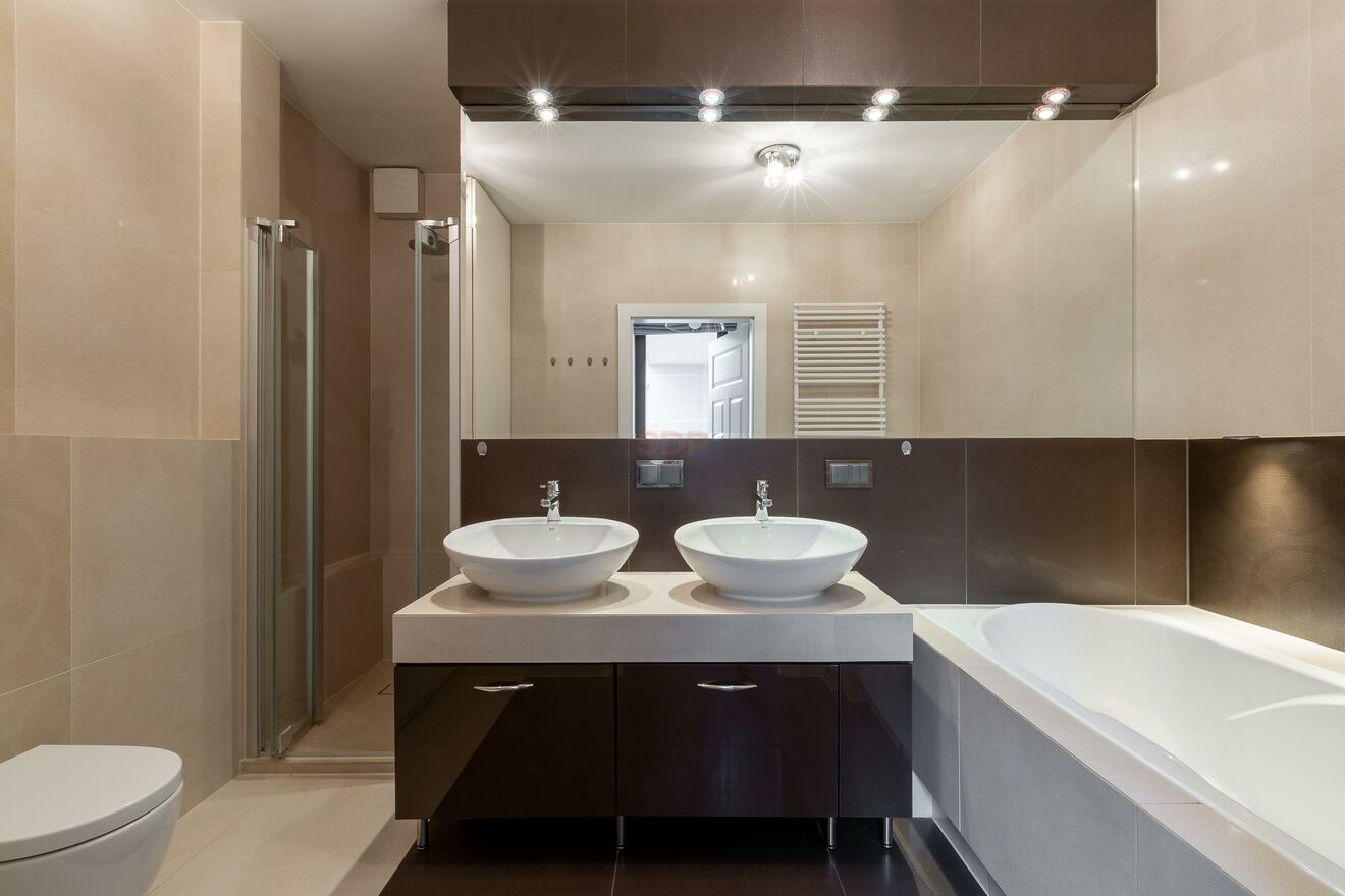 - Łazienka z wc (wanna, prysznic typu walk in, toaleta, pralka w zabudowie)