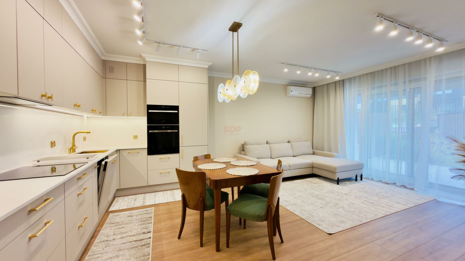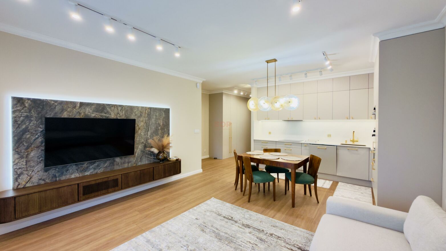 - w salonie rozkładana sofa, szafka RTV, TV, stół, 4 krzesła;