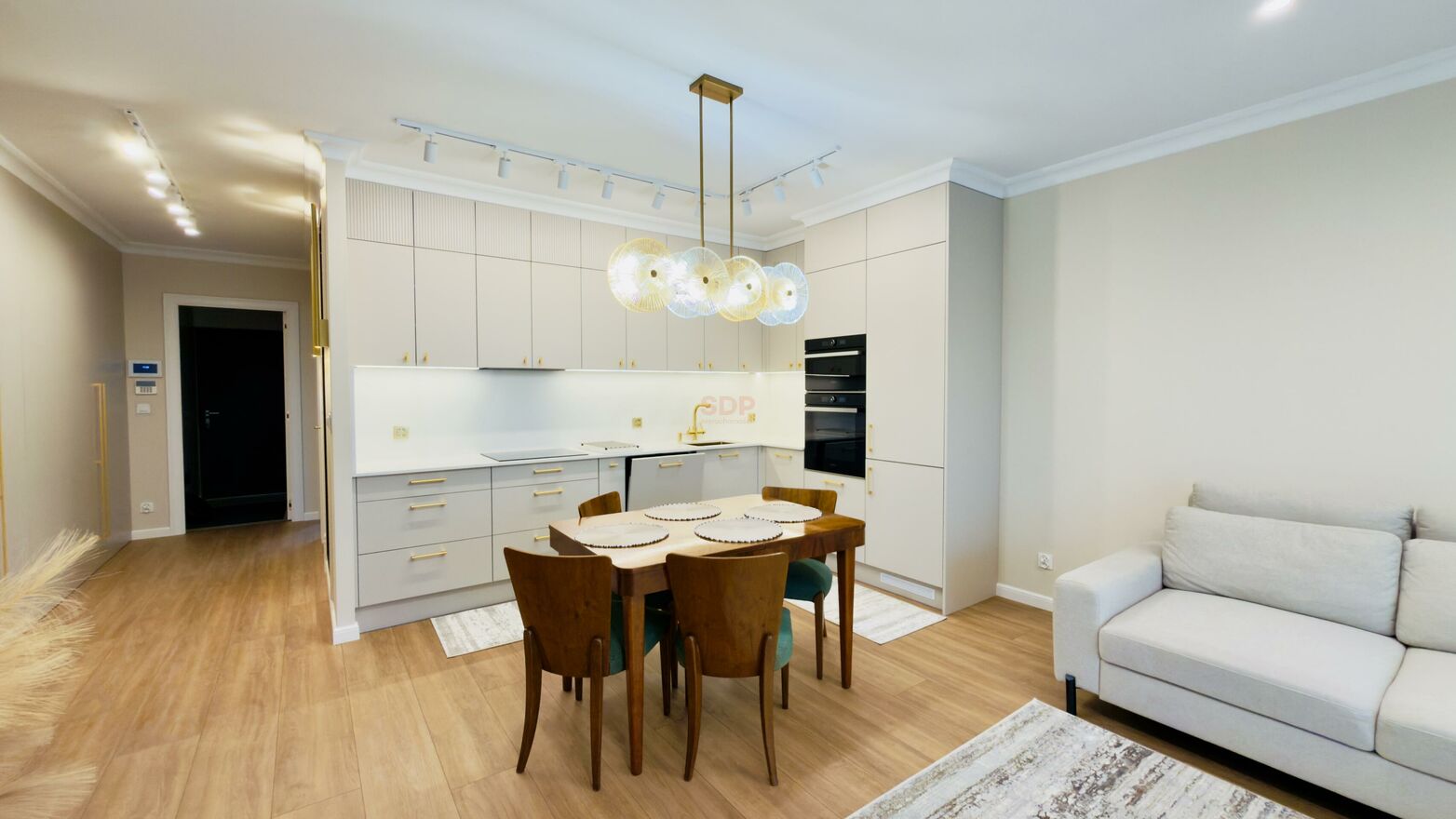 Mieszkanie posiada również garderobę, pomieszczenie gospodarcze z pralką oraz suszarką.