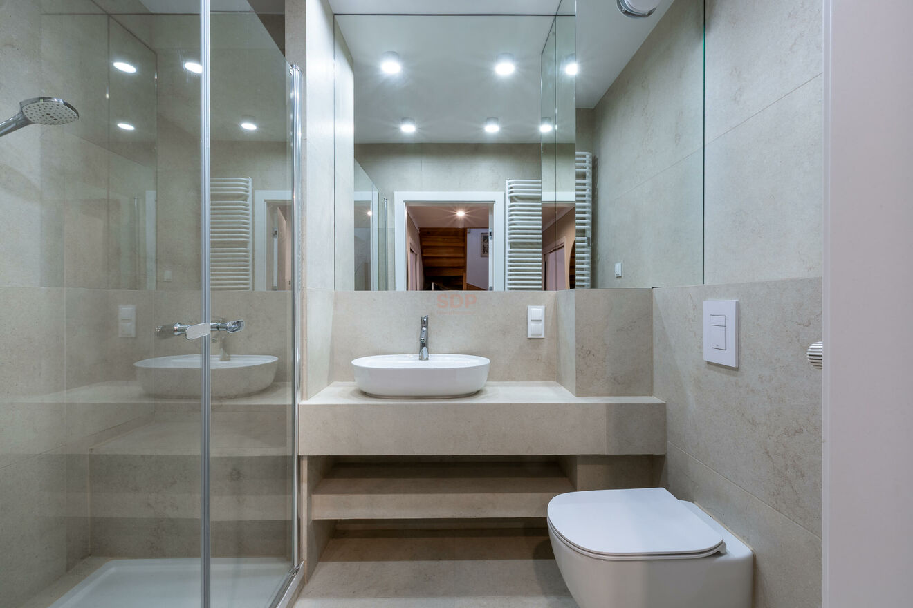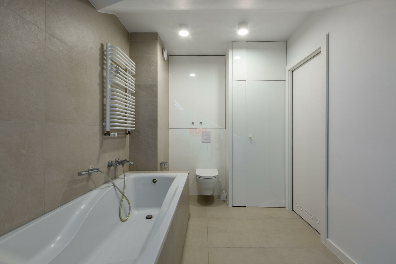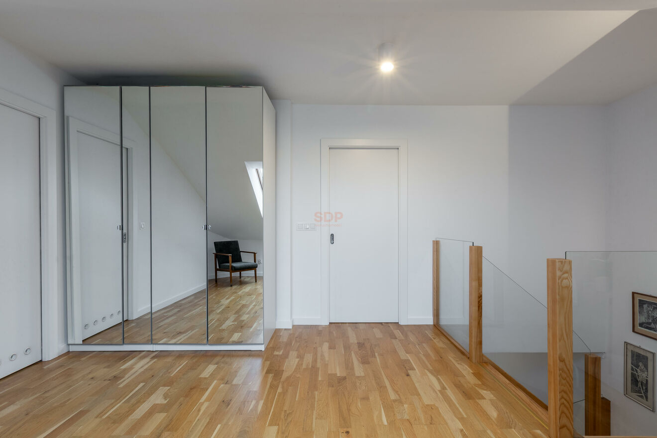 Dwupoziomowy układ mieszkania zapewnia czytelny podział na strefy, co sprzyja zarówno swobodnej pracy, jak i odpoczynkowi.