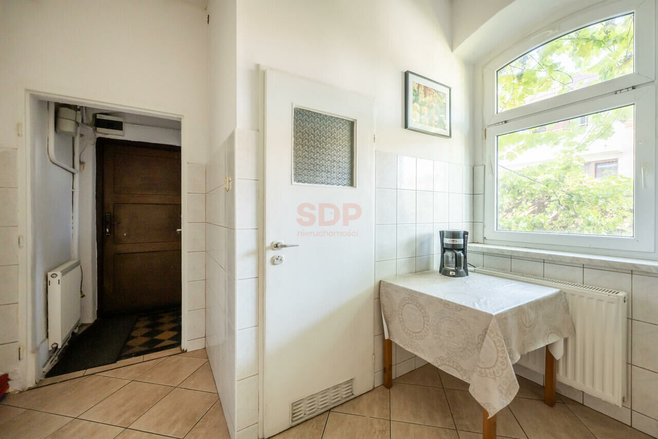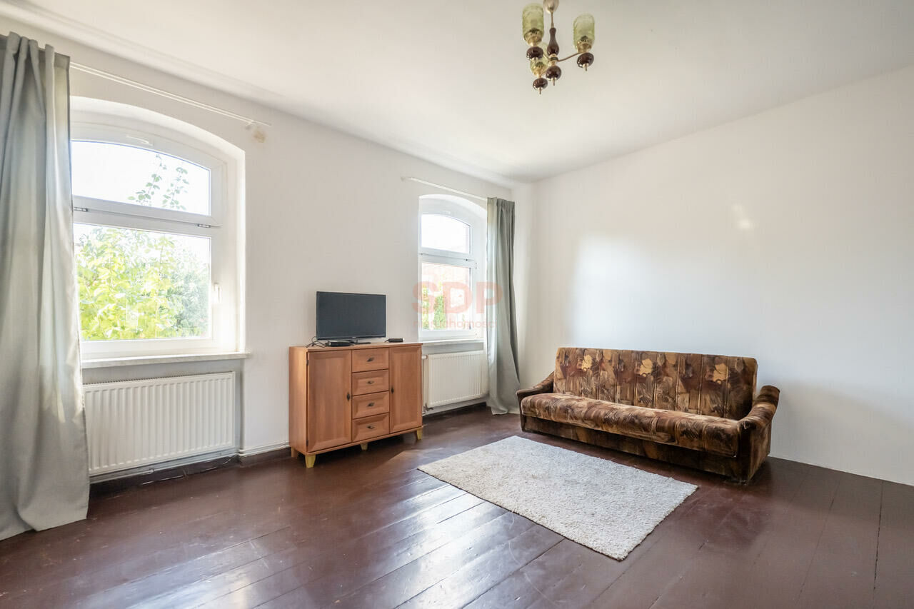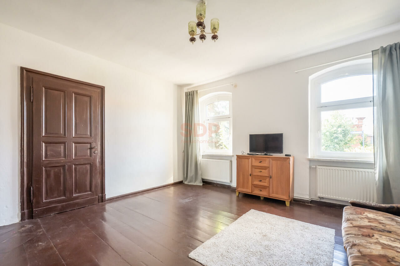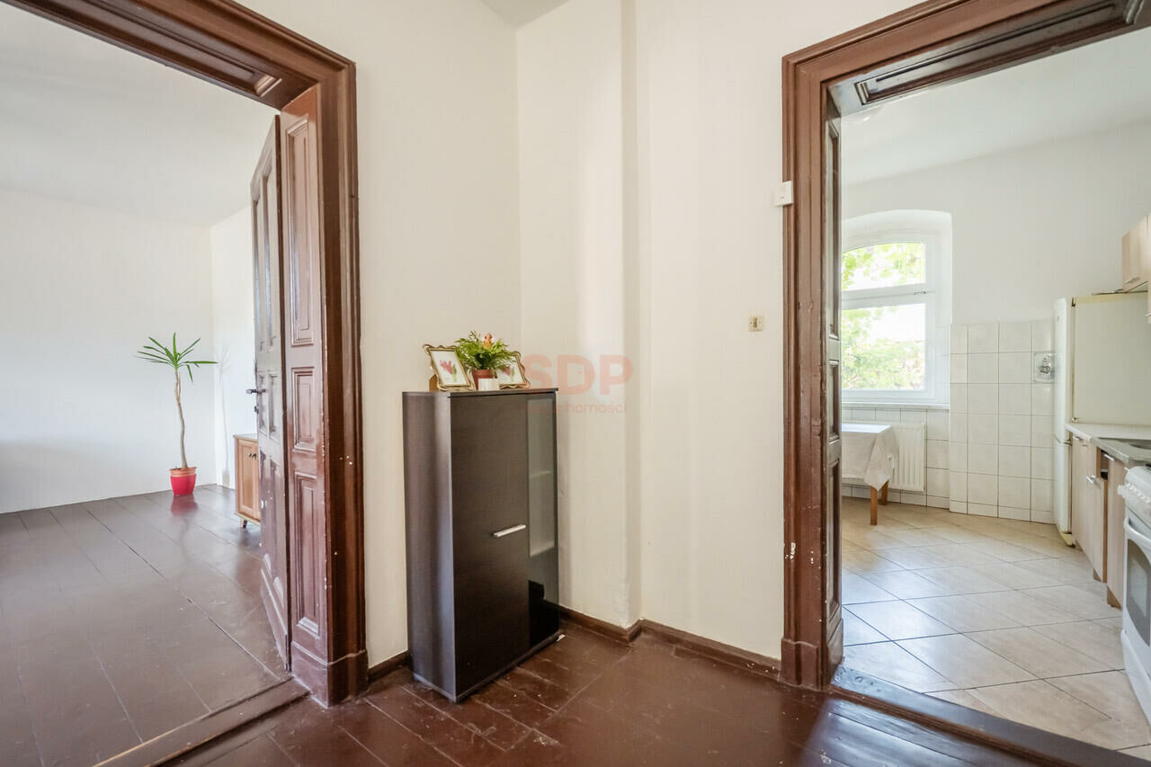 Lokal znajduje się na parterze dwulokalowego budynku. Do mieszkania przynależy również połowa strychu oraz 3 pomieszczenia piwniczne, a także pomieszczenie gospodarcze posadowione na działce na tyłach nieruchomości. Z prawem własności lokalu jest związany udział wynoszący 51,71% we wspólnych częściach budynku i we własności działki o powierzchni 366 m2. Mieszkanie jest bezczynszowe, tak więc właściciel nie ponosi żadnych kosztów oprócz comiesięcznych opłat za korzystanie z mediów. W mieszkaniu zachowała się oryginalna stolarka drzwiowa oraz podłoga z desek. Jest możliwość zrobienia przejścia amfiladowego pomiędzy pokojem dziennym a kuchnią. Mieszkanie jest dobrze doświetlone przez cały dzień ze względu na położenie narożne. Nieruchomość jest położona w bocznej ulicy, gdzie ruch samochodów jest znikomy. Istnieje też możliwość parkowania aut na podjeździe oraz wzdłuż ulicy, na działce jest miejsce do zrobienia podjazdu dla dwóch aut.
