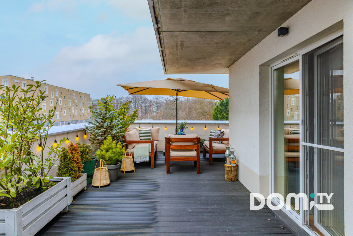- duży ~40m2 prywatny taras wykończony deską tarasową, z oświetleniem i gniazdami elektrycznymi, idealny do spędzania wolnego czasu i relaksu,