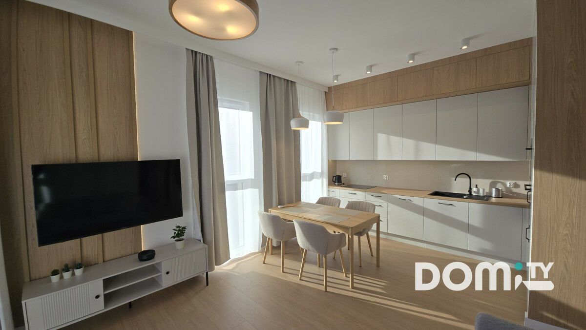 ● salon ze stołem jadalnianym oraz aneksem kuchennym wyposażony w meble stolarskie na wymiar, smart TV 4K (55 cali), kameralne oświetlenie LED oraz komplet sprzętów (płyta indukcyjna, zmywarka, duża lodówka z zamrażalką, piekarnik, mikrofalówka, czajnik elektryczny). Bezpośrednie wyjście z salonu na taras;