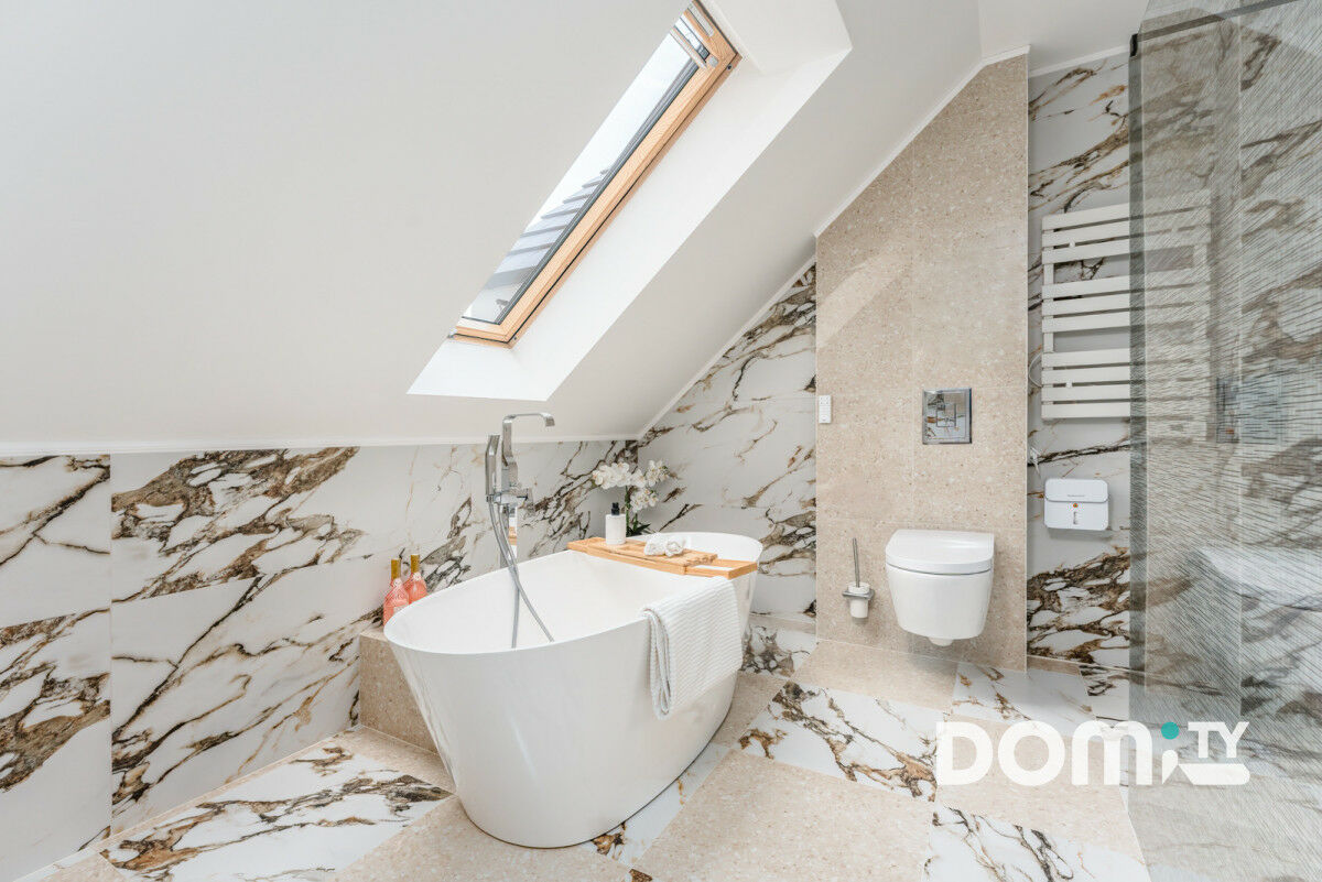 Pokój kąpielowy z wolnostojącą wanną, prysznicem, umywalką wykończony wysokiej klasy armaturą i płytkami. Inteligentna, elektryczna toaleta firmy Roca z funkcjami mycia, osuszania, czujnikiem obecności, oświetleniem LED oraz sterowana na pilota.