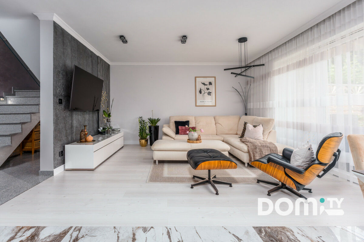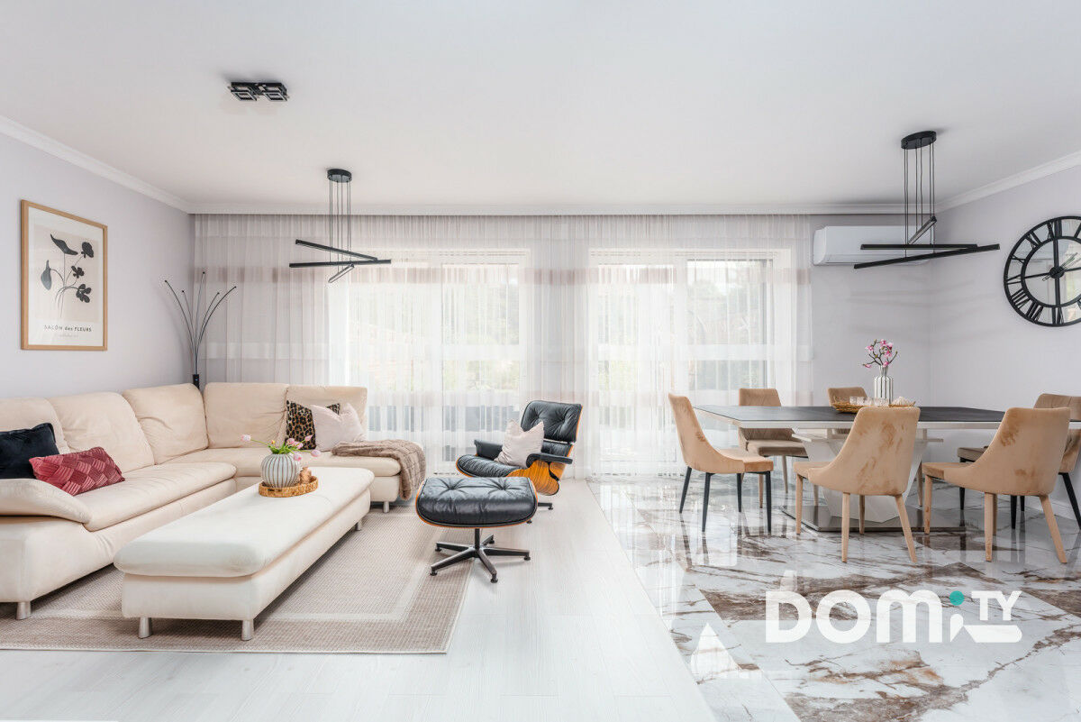 Sercem domu jest przestronny salon połączony z jadalnią i aneksem kuchennym, w którym duże przeszklenia prowadzą na taras oraz pięknie zaaranżowany ogród, zapewniając wyjątkowe doświetlenie wnętrza. Strefy wypoczynkowa, jadalniana i kuchenna tworzą harmonijną, funkcjonalną całość.