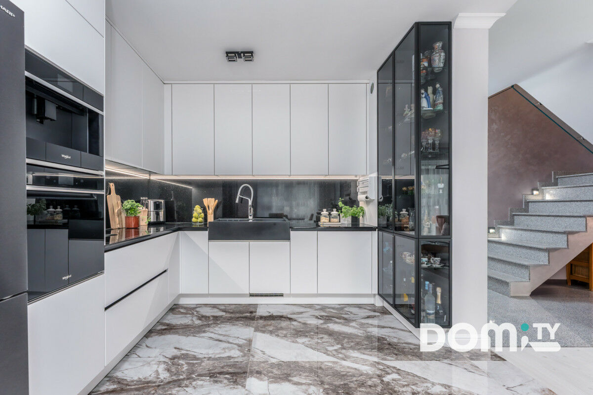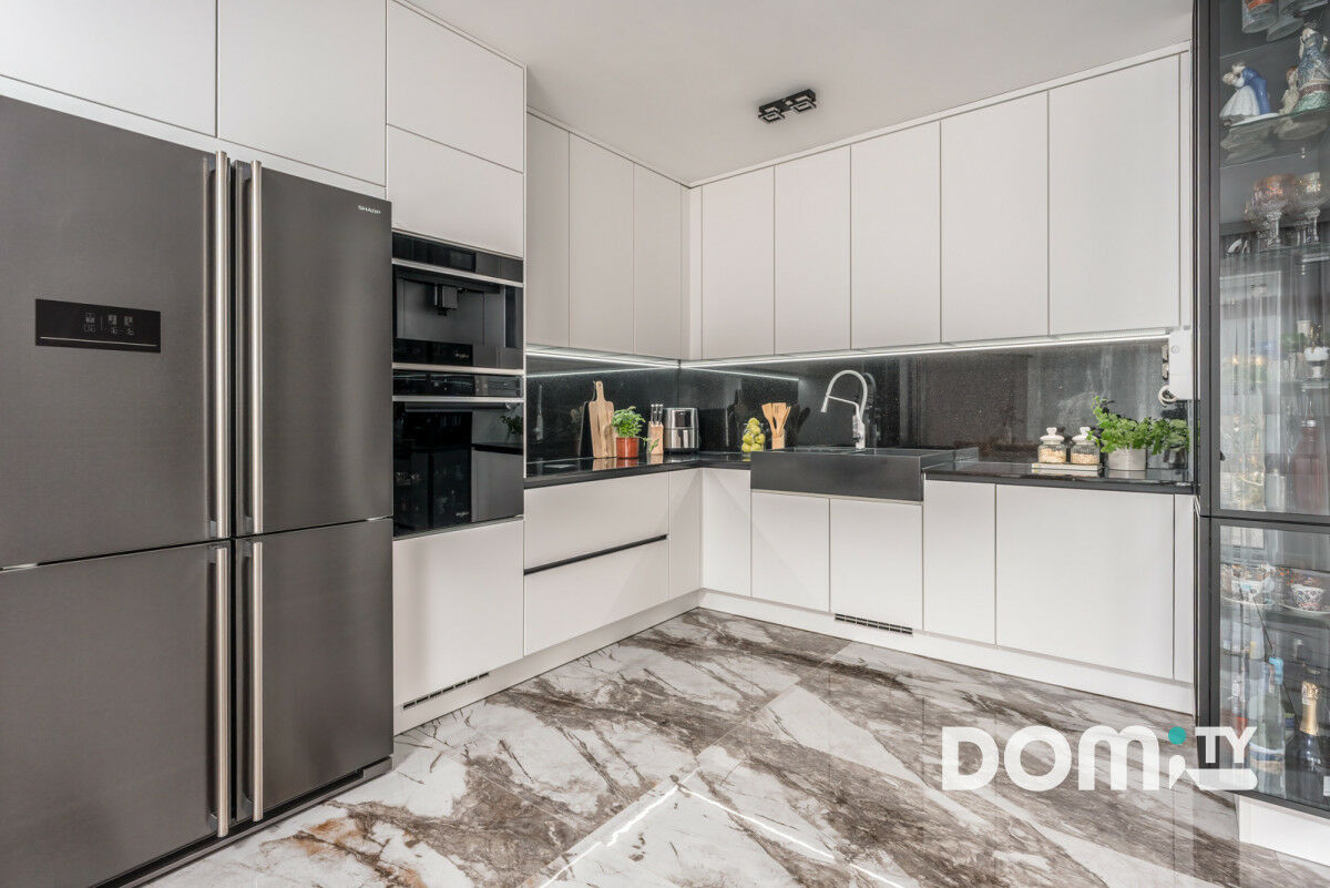 Wykończenie w eleganckim stylu, meble na wymiar, komplet sprzętów w wysokiej jakości, z najwyższą klasą energetyczną A+++ (zmywarka z inteligentną technologią dopasowującą wsad i poziom zabrudzenia naczyń, aby odpowiednio dostosować temperaturę, czas, ilość wody i moc cyklu zmywania, piekarnik z funkcją pary, zwiększoną pojemnością, sterowany z aplikacji, ekspres do kawy w zabudowie, pojemna lodówka side-by-side z technologią AdvanceNoFrost, ledowym oświetleniem oraz cyfrowym wyświetlaczem, płyta indukcyjna z wbudowanym okapem firmy Bora, klasa premium z najniższym poziomem głośności, maksymalną wydajnością i rekordową oszczędnością miejsca) oraz blaty kuchenne kamienne - granitowe sprawiają, że kuchnia jest ponadczasowa i stworzona na długie lata użytkowania. Całość dopełnia klimatyczne oświetlenie.
